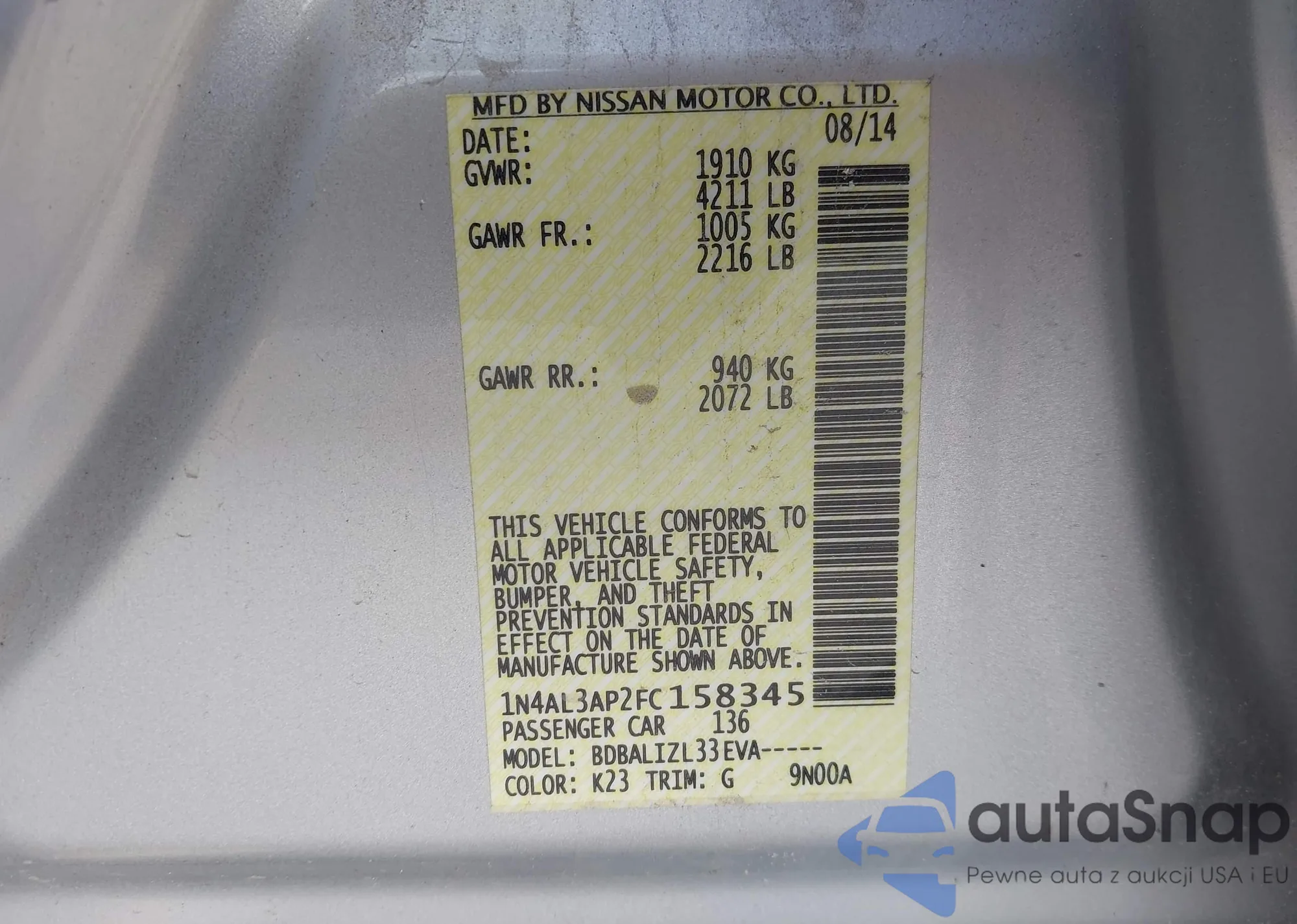 The car Nissan Altima 2015 (VIN 1N4AL3AP2FC158345) has already been auctioned 1 times and/or is sold by an unverified seller. We recommend checking the Carfax report and confirming registration possibilities before purchase.