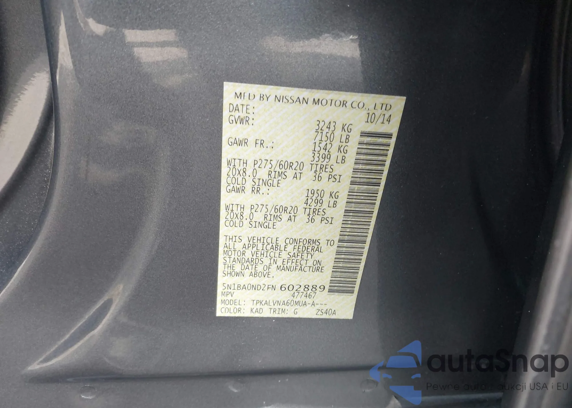 The car Nissan Armada 2015 (VIN 5N1BA0ND2FN602889) is sold by an unverified seller. We recommend checking the Carfax report and confirming registration possibilities before purchase.