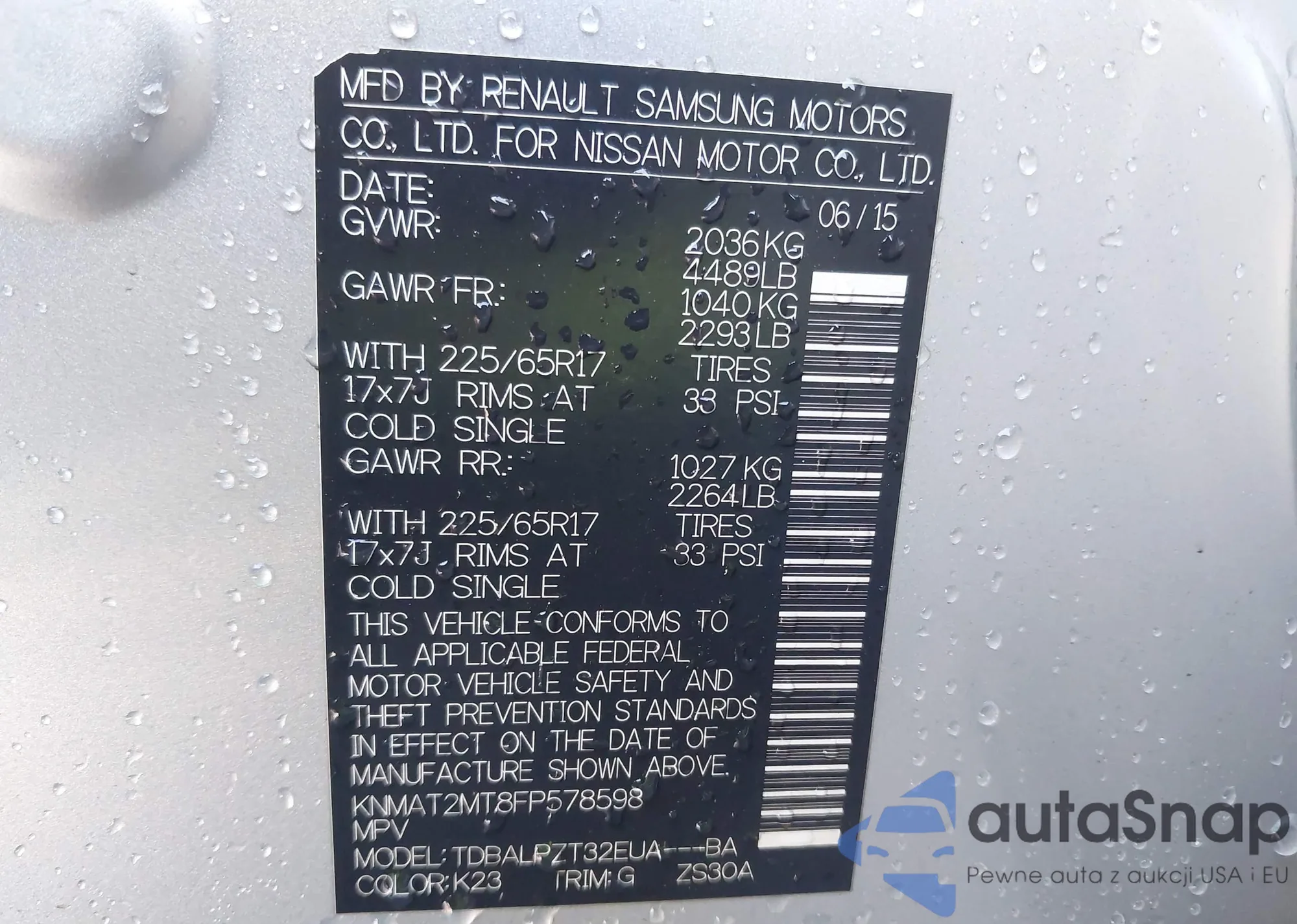 The car Nissan Rogue 2015 (VIN KNMAT2MT8FP578598) has not been auctioned before. The documents are clean, and the mileage matches or is below the market average. Sold by an insurance company – we recommend purchase. Delivery to the port will take approx. 6–8 weeks.