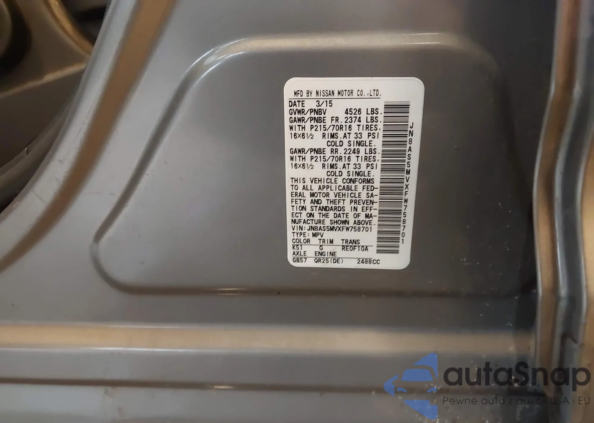 • VIN: JN8AS5MVXFW758701