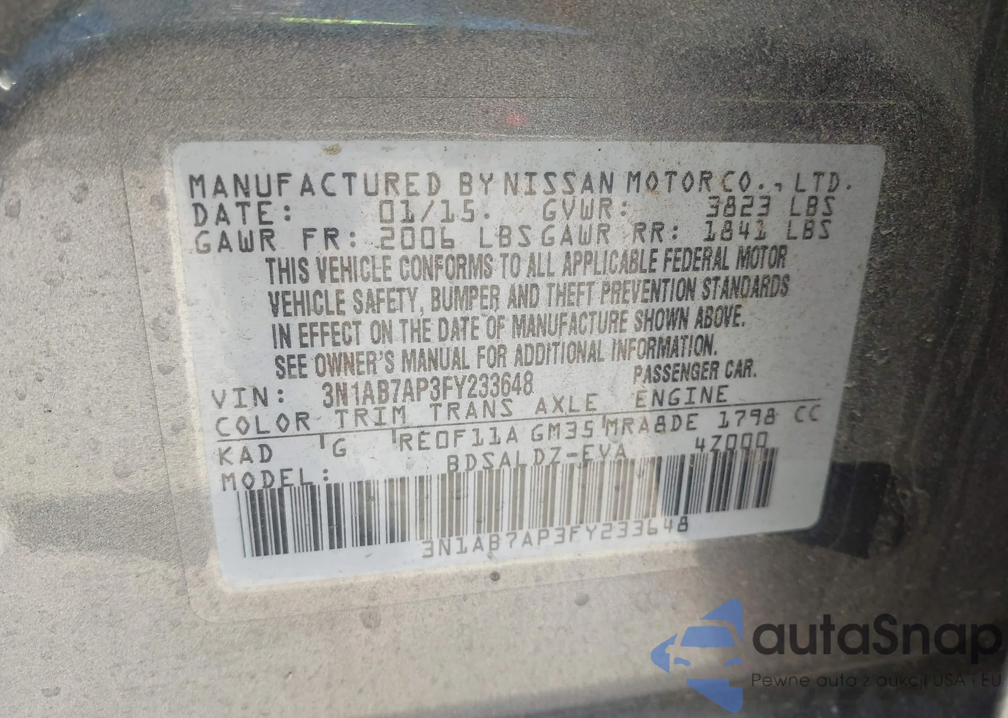 The car Nissan Sentra 2015 (VIN 3N1AB7AP3FY233648) has not been auctioned before. The documents are clean, and the mileage matches or is below the market average. Sold by an insurance company – we recommend purchase. Delivery to the port will take approx. 6–8 weeks.