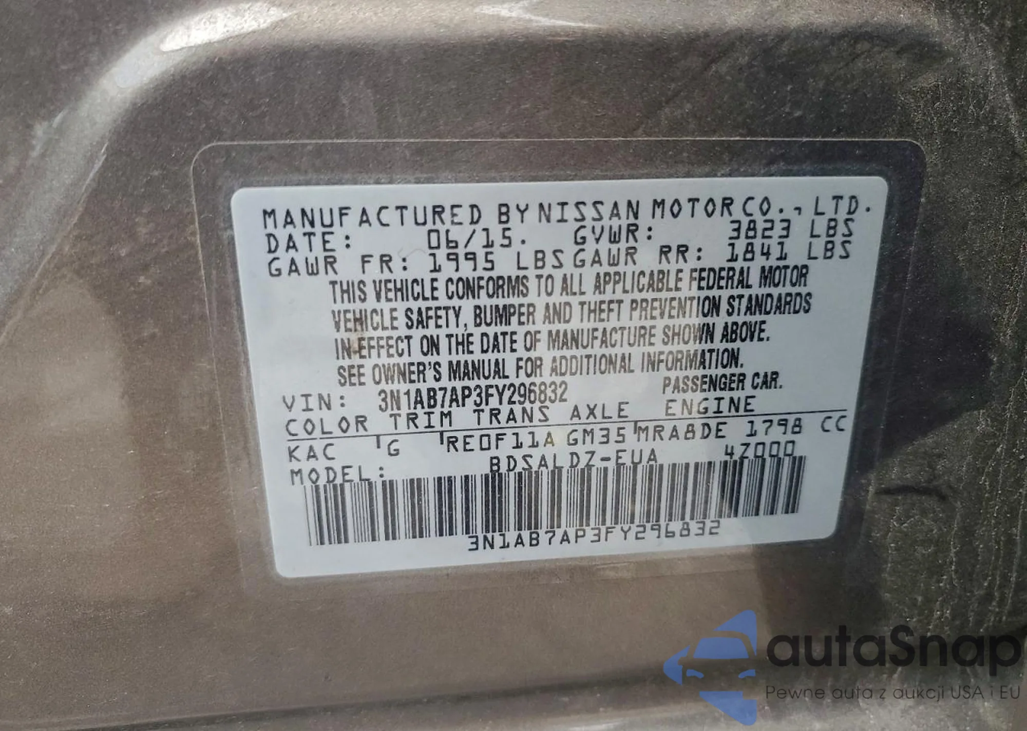 The car Nissan Sentra 2015 (VIN 3N1AB7AP3FY296832) is sold by an unverified seller. We recommend checking the Carfax report and confirming registration possibilities before purchase.