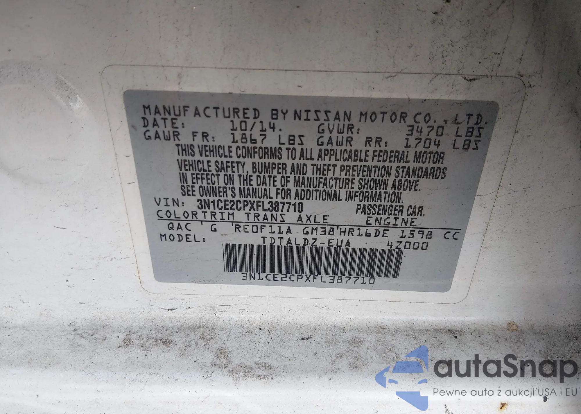 The car Nissan Versa 2015 (VIN 3N1CE2CPXFL387710) is sold by an unverified seller. We recommend checking the Carfax report and confirming registration possibilities before purchase.