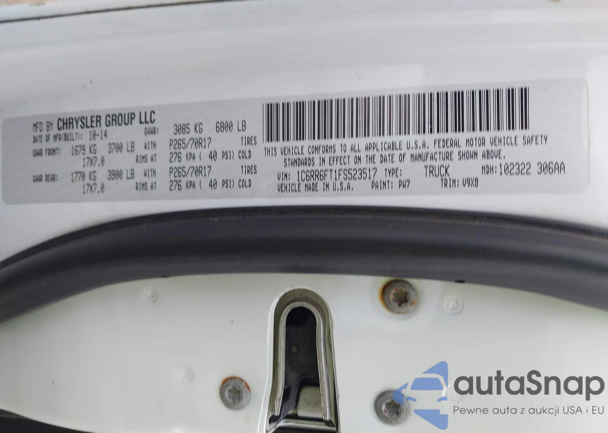 The car RAM 1500 2015 (VIN 1C6RR6FT1FS523517) has not been auctioned before. The documents are clean, and the mileage matches or is below the market average. Sold by an insurance company – we recommend purchase. Delivery to the port will take approx. 6–8 weeks.