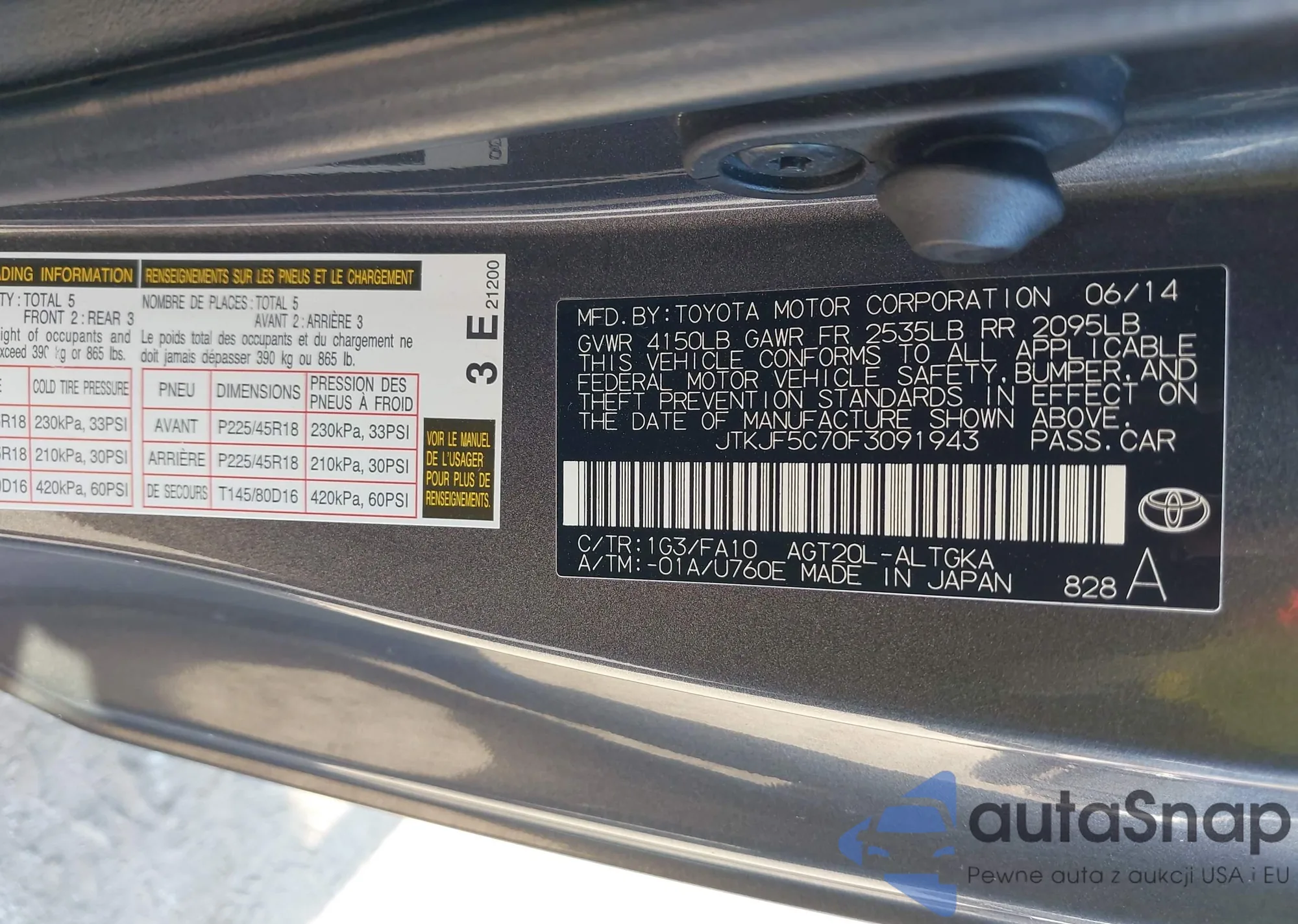 The car Scion tC 2015 (VIN JTKJF5C70F3091943) has documents that prevent registration. Export and registration may be difficult. Contact AutaSnap experts to find alternatives.