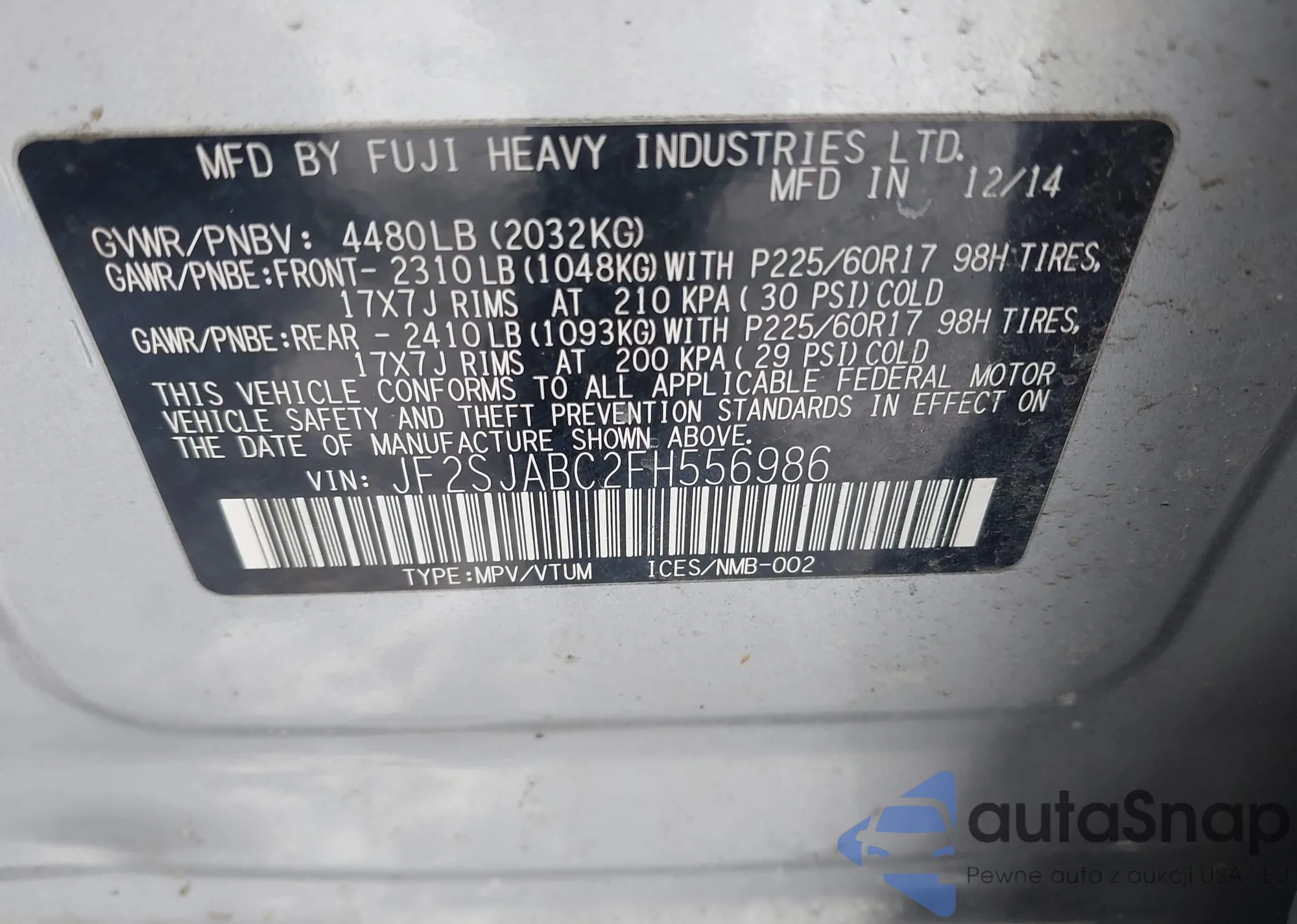 The car Subaru Forester 2015 (VIN JF2SJABC2FH556986) has not been auctioned before. The documents are clean, and the mileage matches or is below the market average. Sold by an insurance company – we recommend purchase. Delivery to the port will take approx. 6–8 weeks.