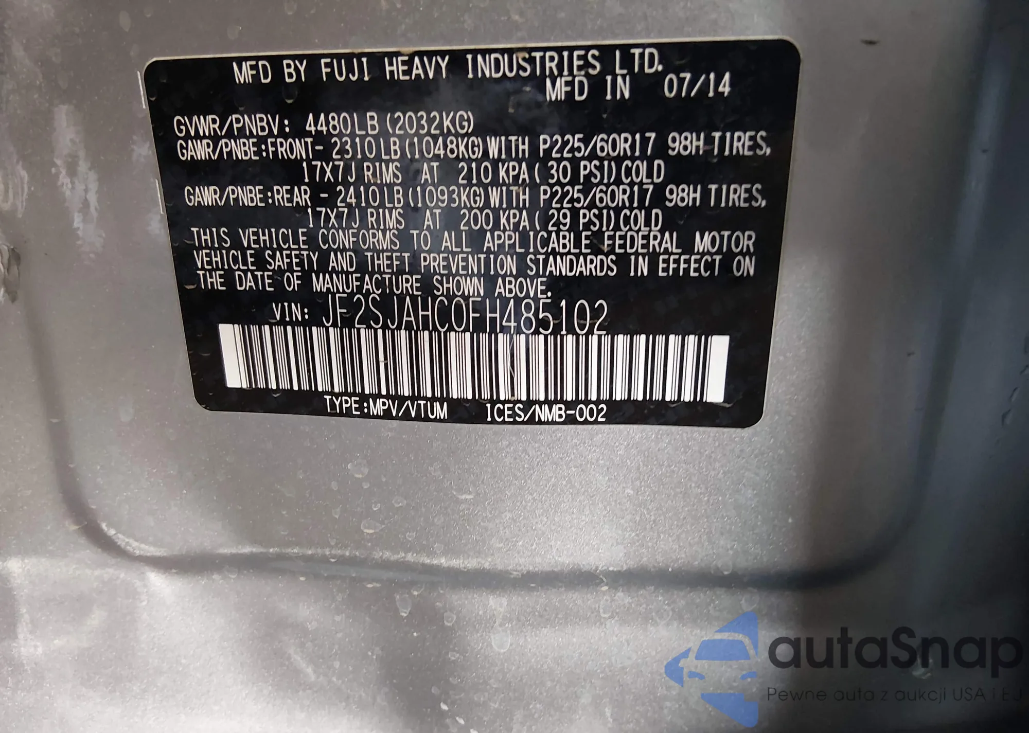The car Subaru Forester 2015 (VIN JF2SJAHC0FH485102) has not been auctioned before. The documents are clean, and the mileage matches or is below the market average. Sold by an insurance company – we recommend purchase. Delivery to the port will take approx. 6–8 weeks.