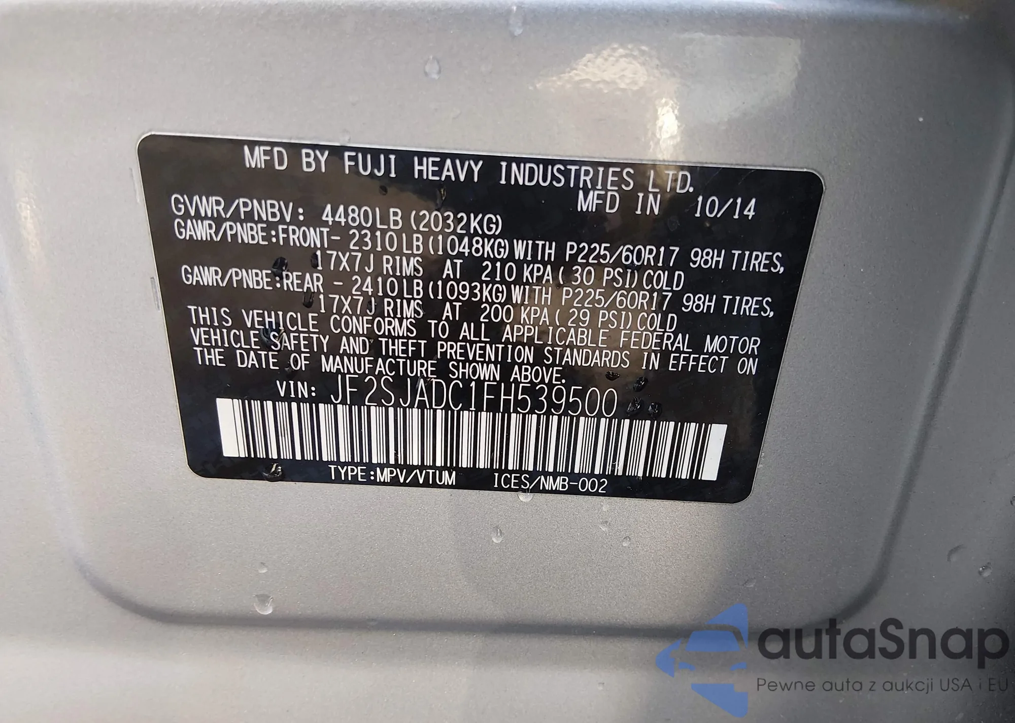 • VIN: JF2SJADC1FH539500