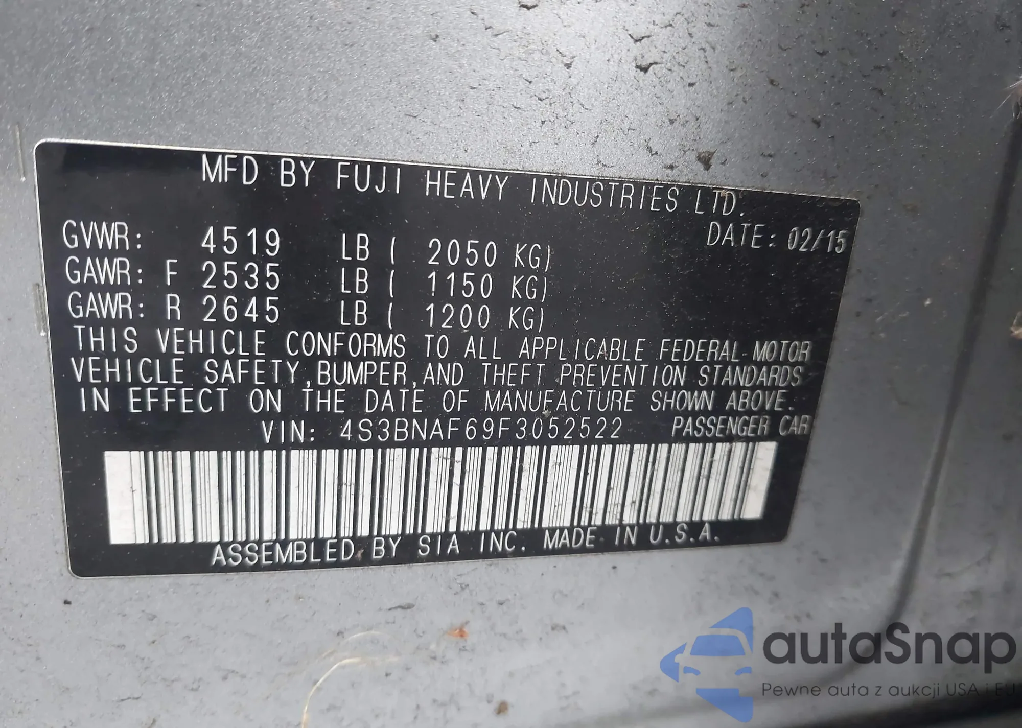 The car Subaru Legacy 2015 (VIN 4S3BNAF69F3052522) has not been auctioned before. The documents are clean, and the mileage matches or is below the market average. Sold by an insurance company – we recommend purchase. Delivery to the port will take approx. 6–8 weeks.
