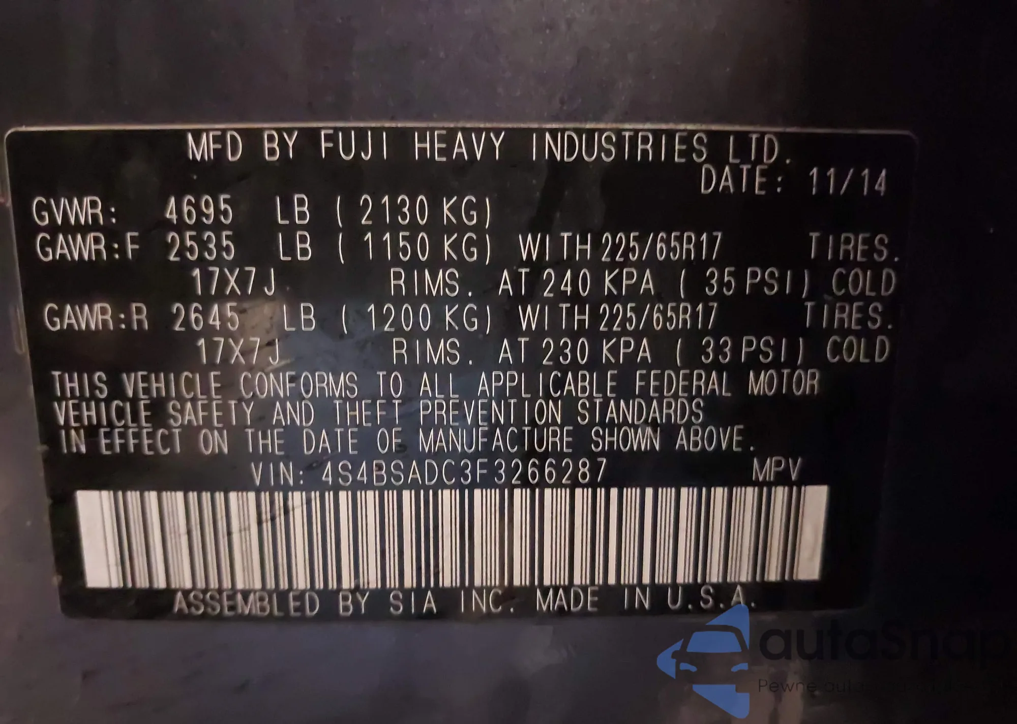 • VIN: 4S4BSADC3F3266287