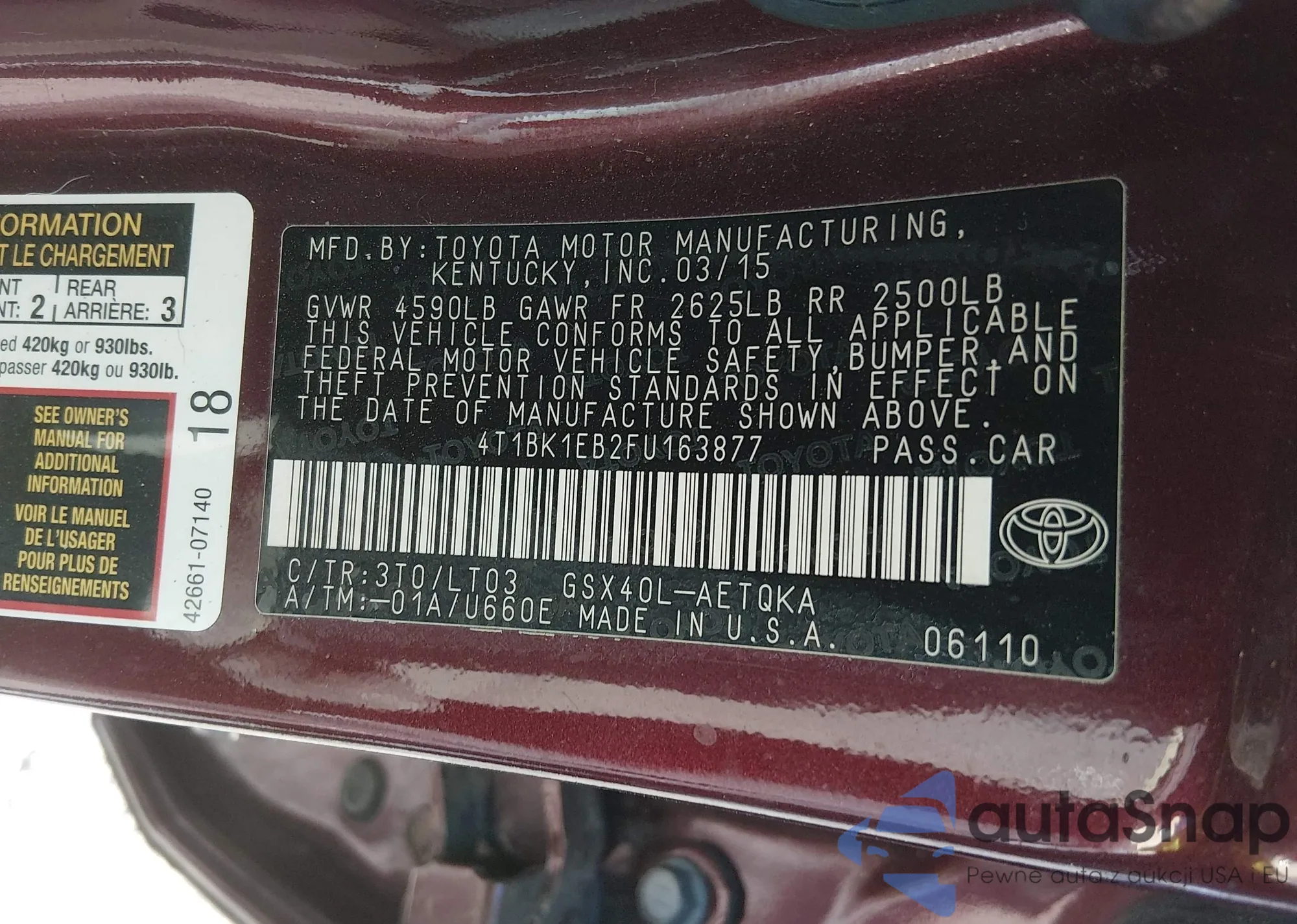 The car Toyota Avalon 2015 (VIN 4T1BK1EB2FU163877) has not been auctioned before. The documents are clean, and the mileage matches or is below the market average. Sold by an insurance company – we recommend purchase. Delivery to the port will take approx. 6–8 weeks.