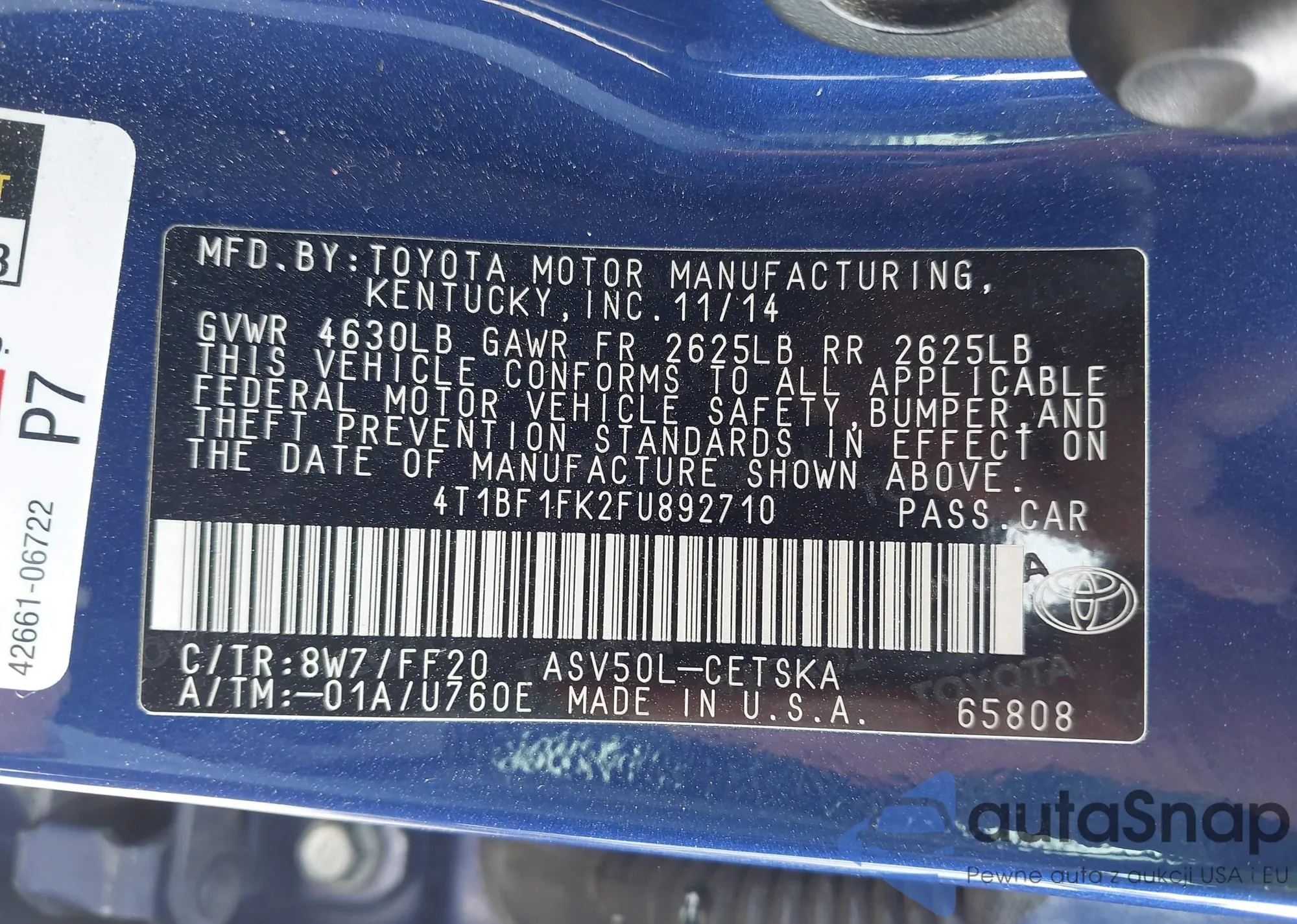 • VIN: 4T1BF1FK2FU892710
