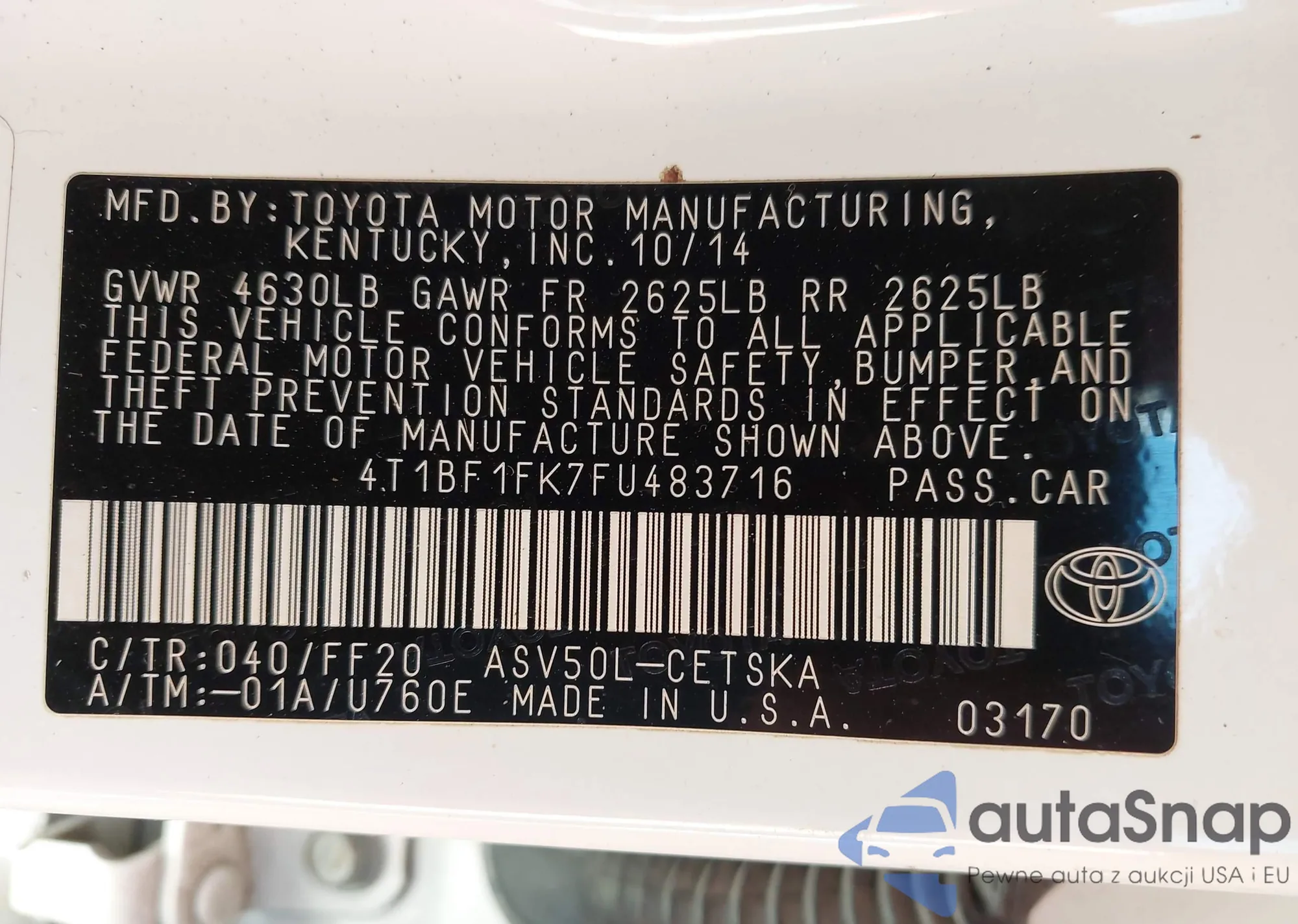 VIN: 4T1BF1FK7FU483716