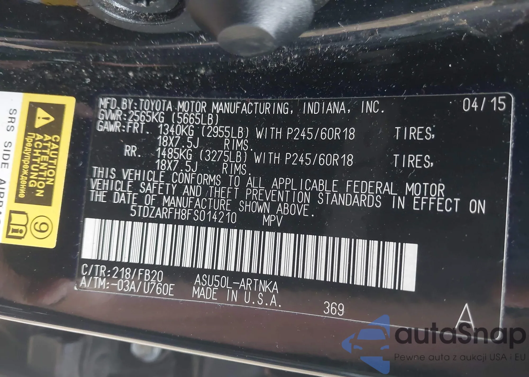 The car Toyota Highlander 2015 (VIN 5TDZARFH8FS014210) has not been auctioned before. The documents are clean, and the mileage matches or is below the market average. Sold by an insurance company – we recommend purchase. Delivery to the port will take approx. 6–8 weeks.