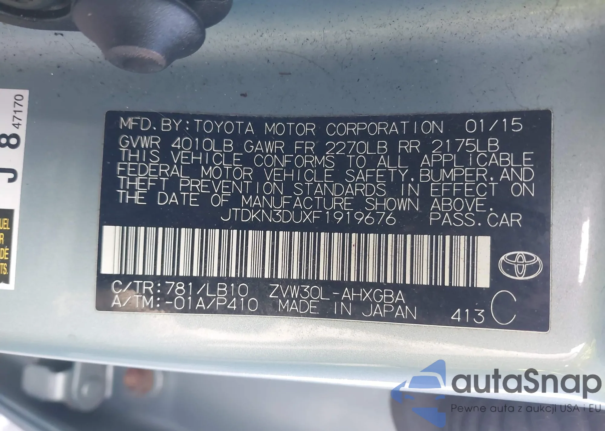 The car Toyota Prius 2015 (VIN JTDKN3DUXF1919676) has not been auctioned before. The documents are clean, and the mileage matches or is below the market average. Sold by an insurance company – we recommend purchase. Delivery to the port will take approx. 6–8 weeks.