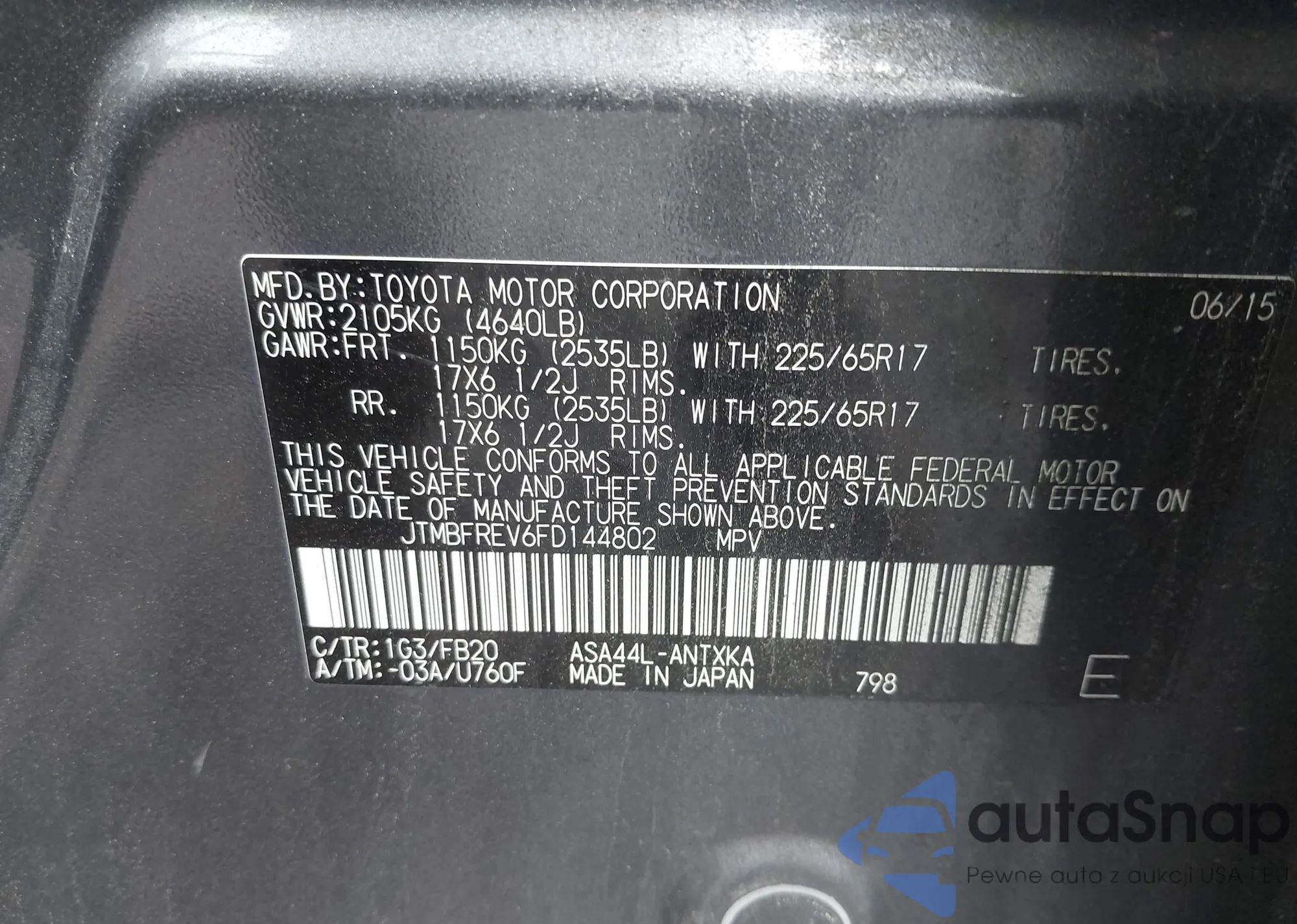 The car Toyota RAV 4 2015 (VIN JTMBFREV6FD144802) has not been auctioned before. The documents are clean, and the mileage matches or is below the market average. Sold by an insurance company – we recommend purchase. Delivery to the port will take approx. 6–8 weeks.