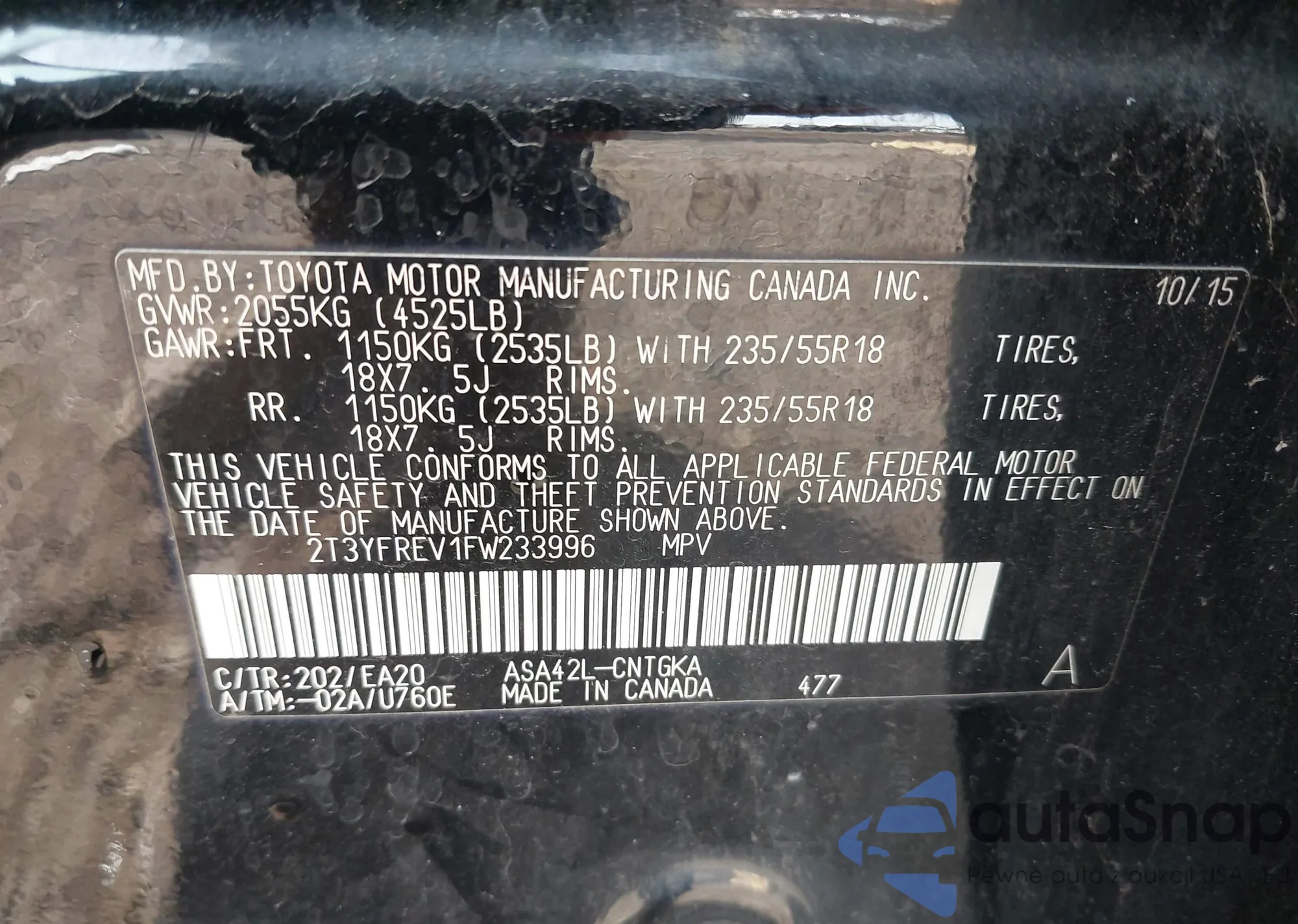 The car Toyota RAV 4 2015 (VIN 2T3YFREV1FW233996) has not been auctioned before. The documents are clean, and the mileage matches or is below the market average. Sold by an insurance company – we recommend purchase. Delivery to the port will take approx. 6–8 weeks.