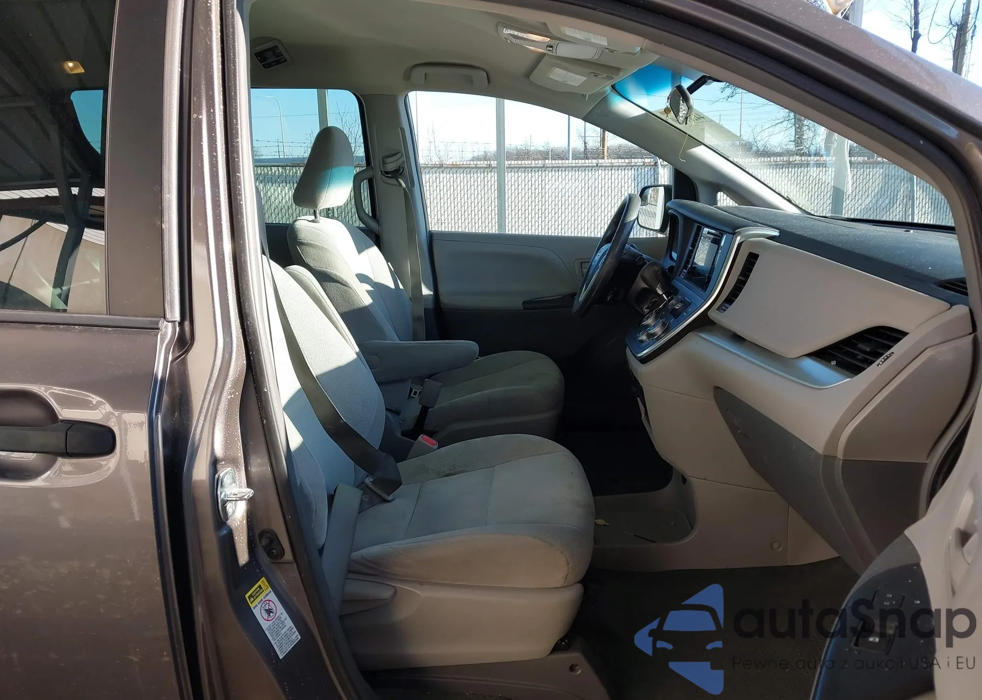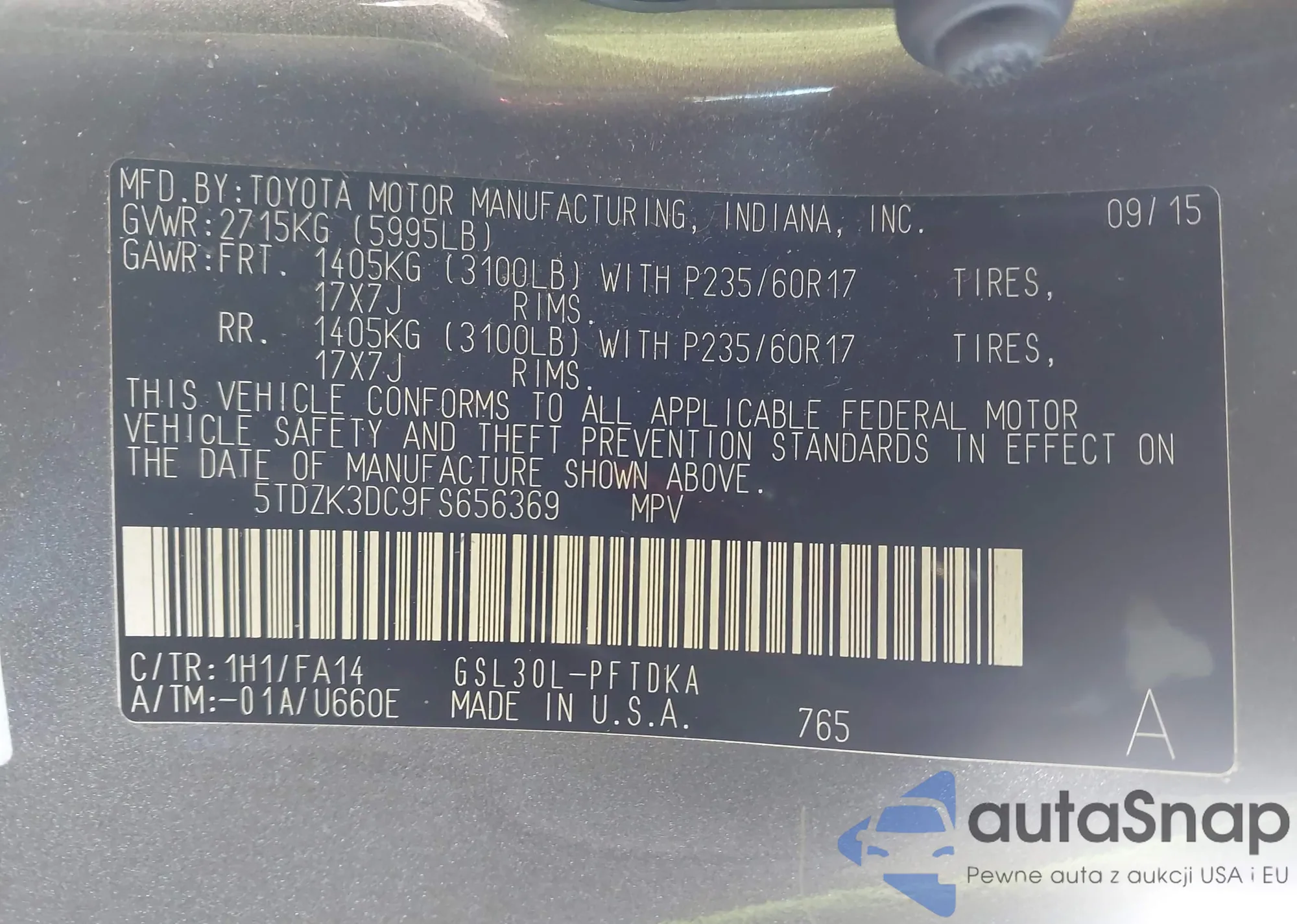 The car Toyota Sienna 2015 (VIN 5TDZK3DC9FS656369) has not been auctioned before. The documents are clean, and the mileage matches or is below the market average. Sold by an insurance company – we recommend purchase. Delivery to the port will take approx. 6–8 weeks.