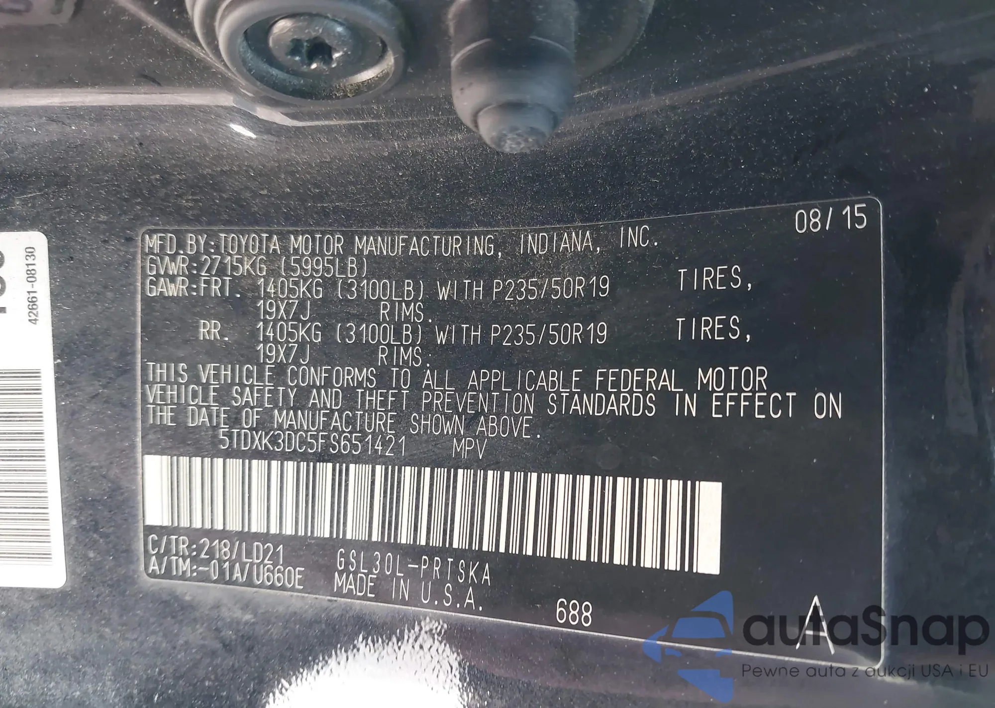 The car Toyota Sienna 2015 (VIN 5TDXK3DC5FS651421) has not been auctioned before. The documents are clean, and the mileage matches or is below the market average. Sold by an insurance company – we recommend purchase. Delivery to the port will take approx. 6–8 weeks.