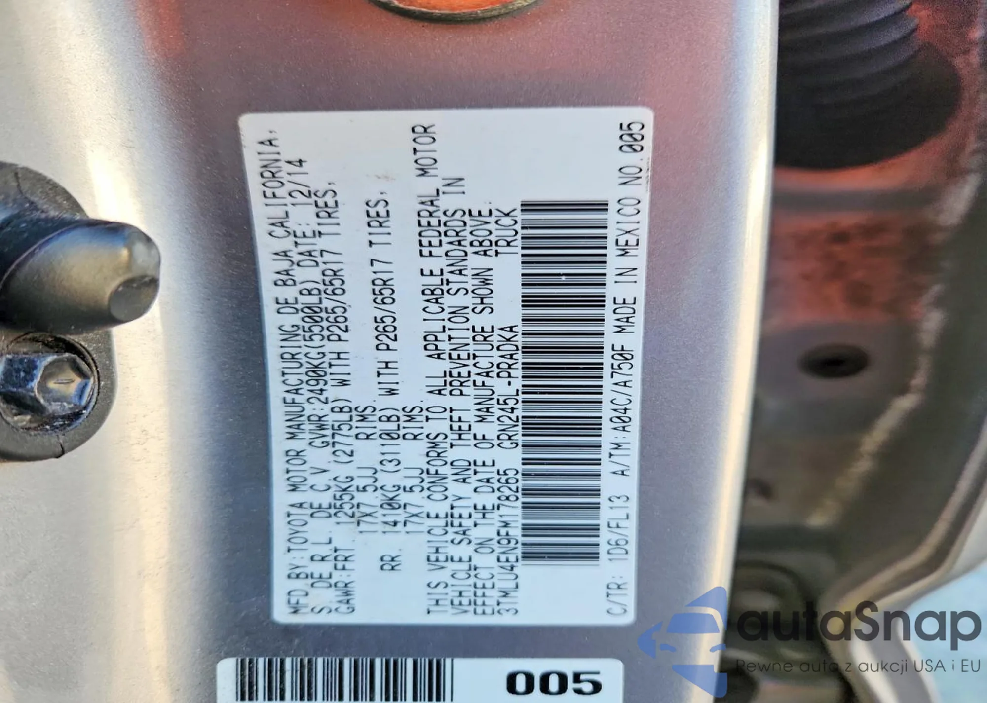 The car Toyota Tacoma 2015 (VIN 3TMLU4EN9FM178265) is sold by an unverified seller. We recommend checking the Carfax report and confirming registration possibilities before purchase.