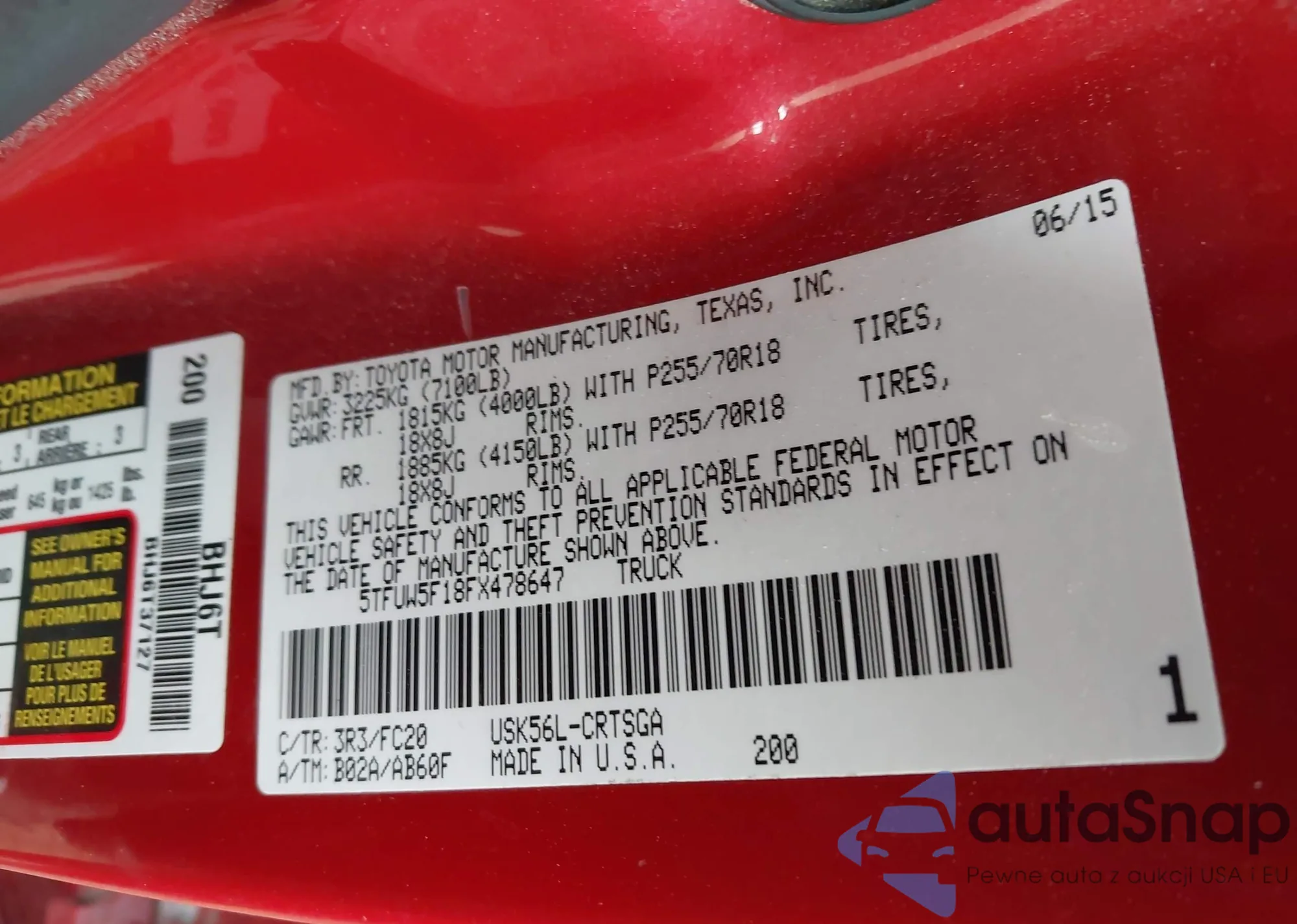 The car Toyota Tundra 2015 (VIN 5TFUW5F18FX478647) has not been auctioned before. The documents are clean, and the mileage matches or is below the market average. Sold by an insurance company – we recommend purchase. Delivery to the port will take approx. 6–8 weeks.