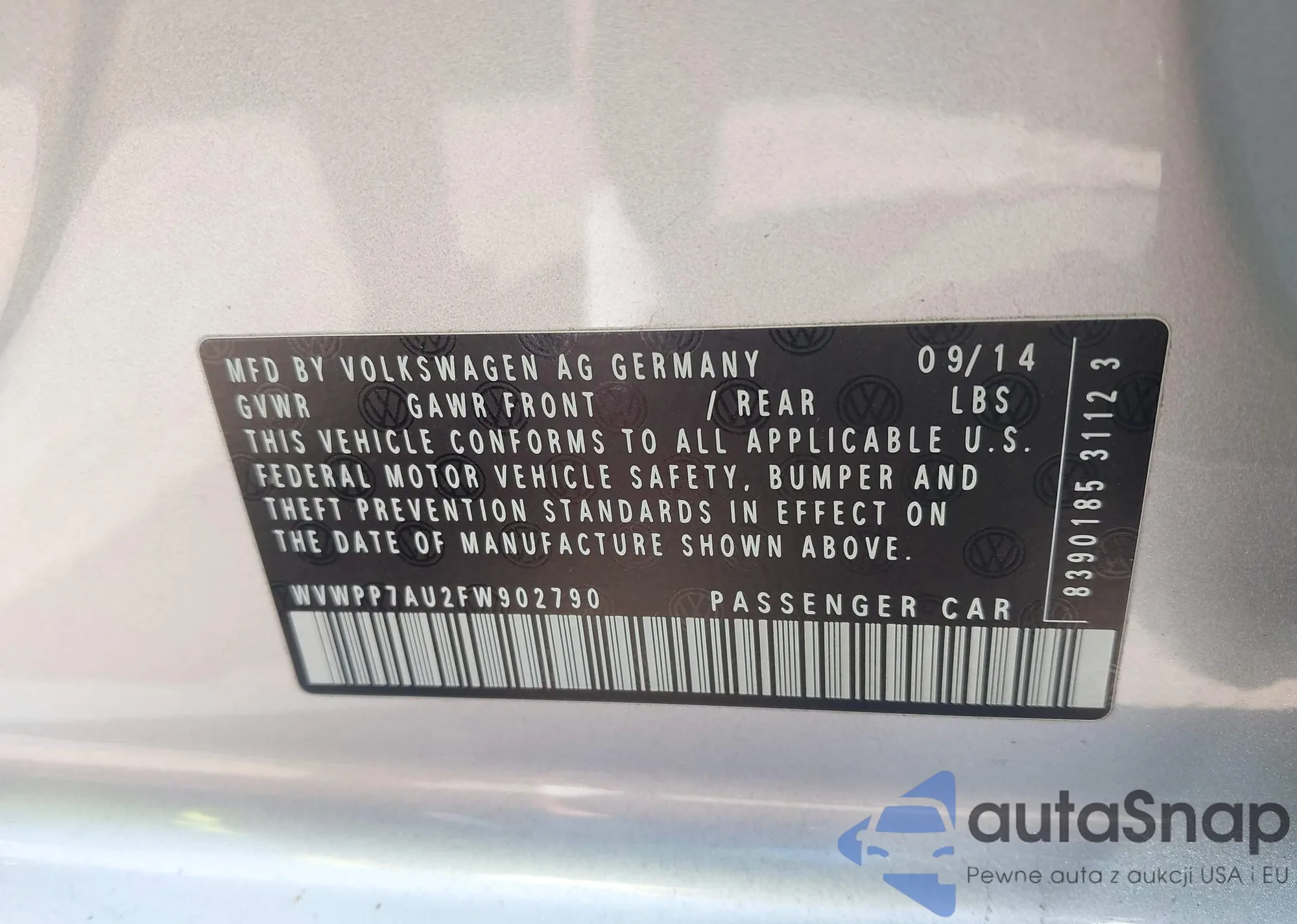 VIN: WVWPP7AU2FW902790