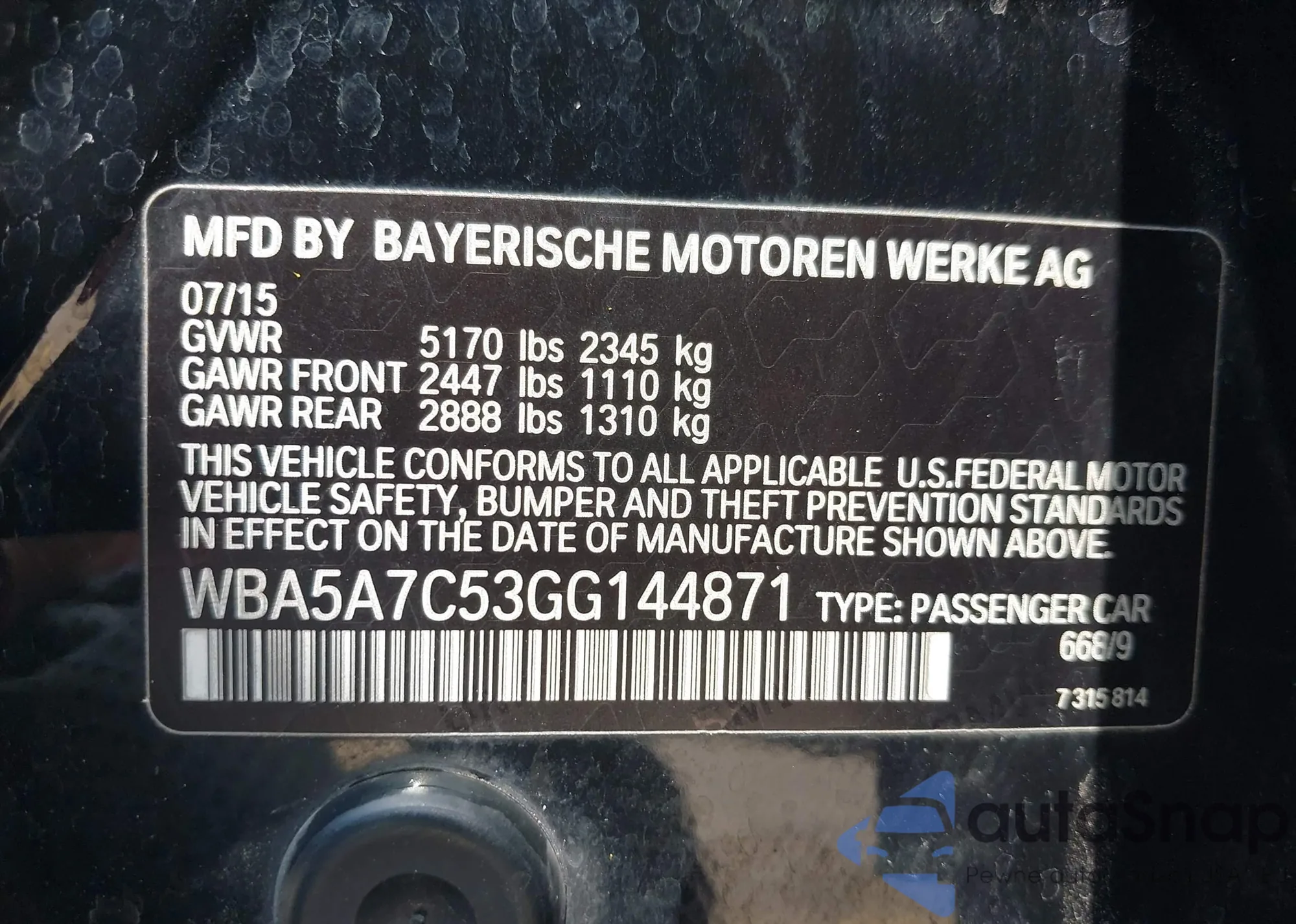 VIN: WBA5A7C53GG144871