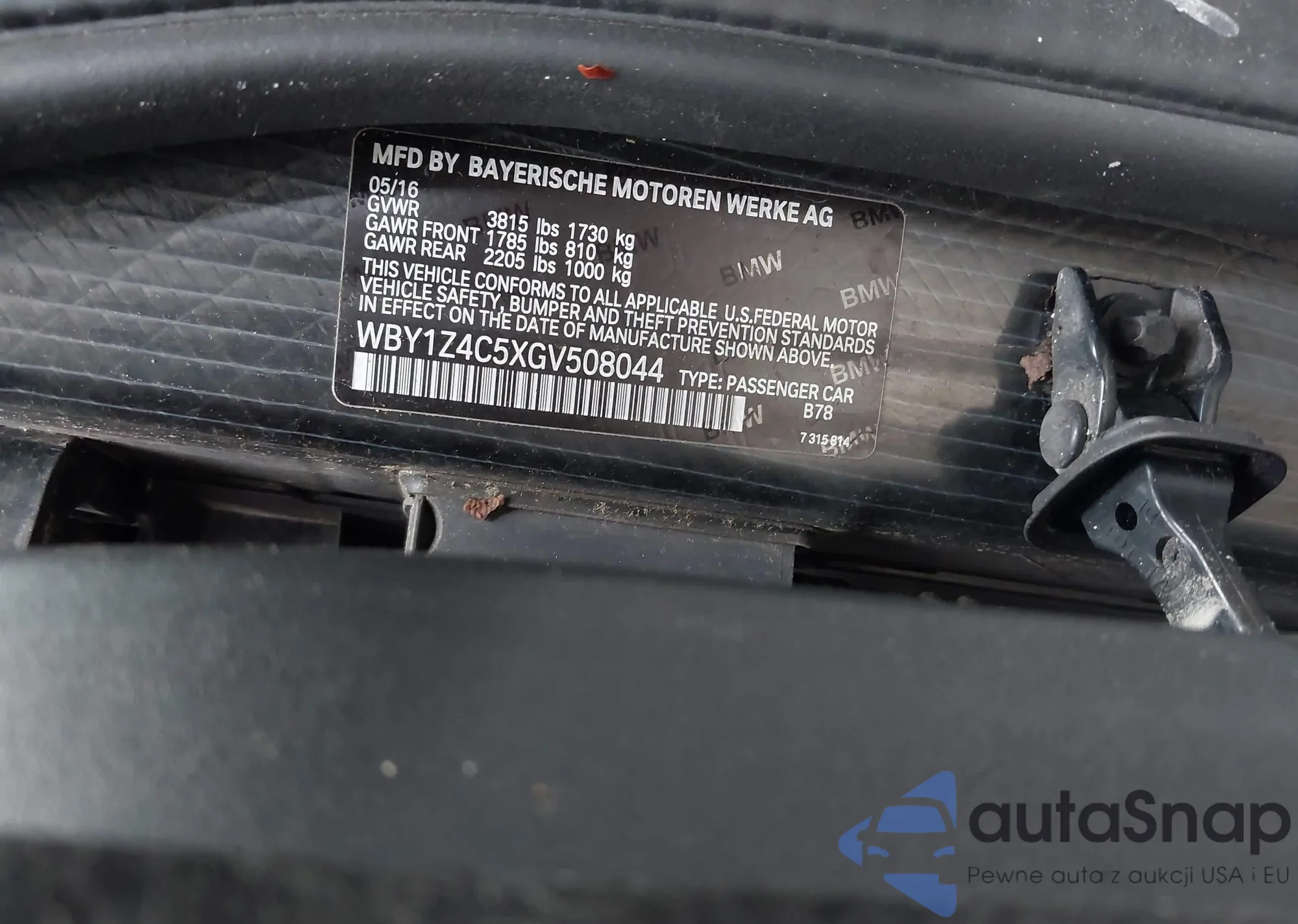 The car BMW i3 2016 (VIN WBY1Z4C5XGV508044) has documents that prevent registration. Export and registration may be difficult. Contact AutaSnap experts to find alternatives.