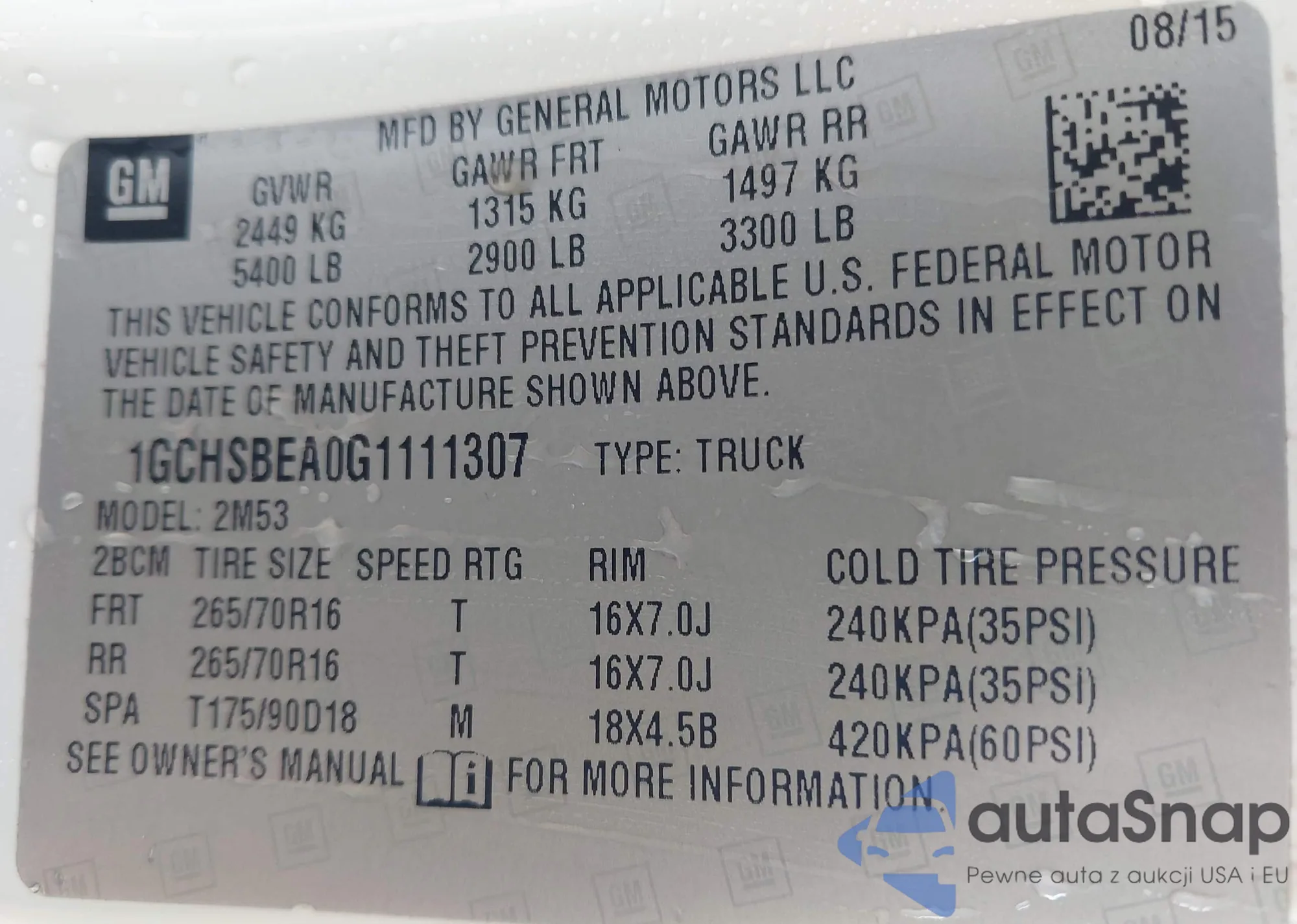 The car Chevrolet Colorado 2016 (VIN 1GCHSBEA0G1111307) has documents that prevent registration. Export and registration may be difficult. Contact AutaSnap experts to find alternatives.