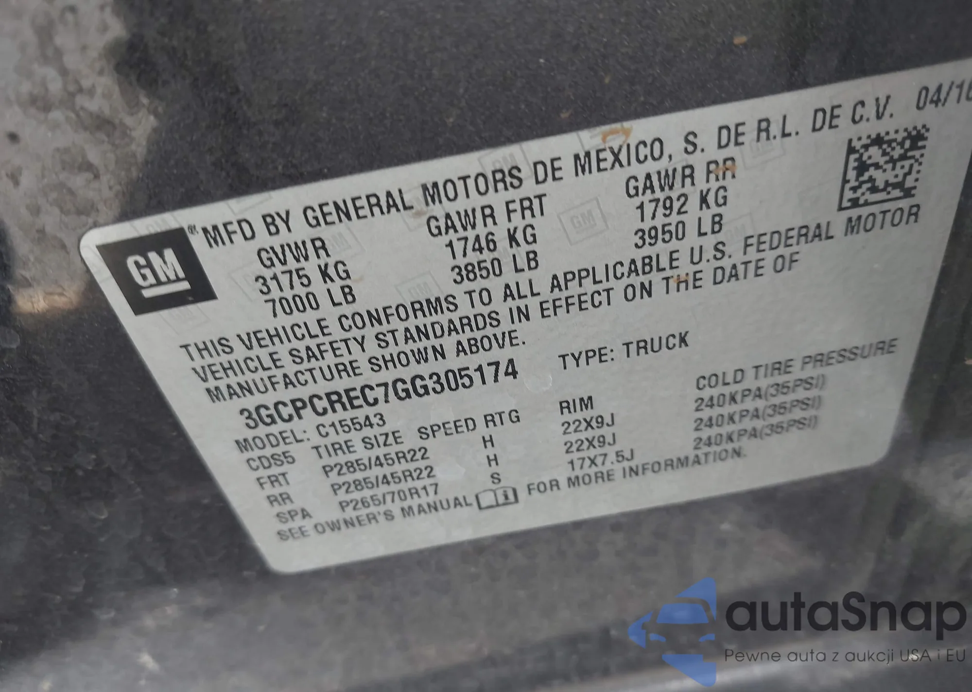 VIN: 3GCPCREC7GG305174