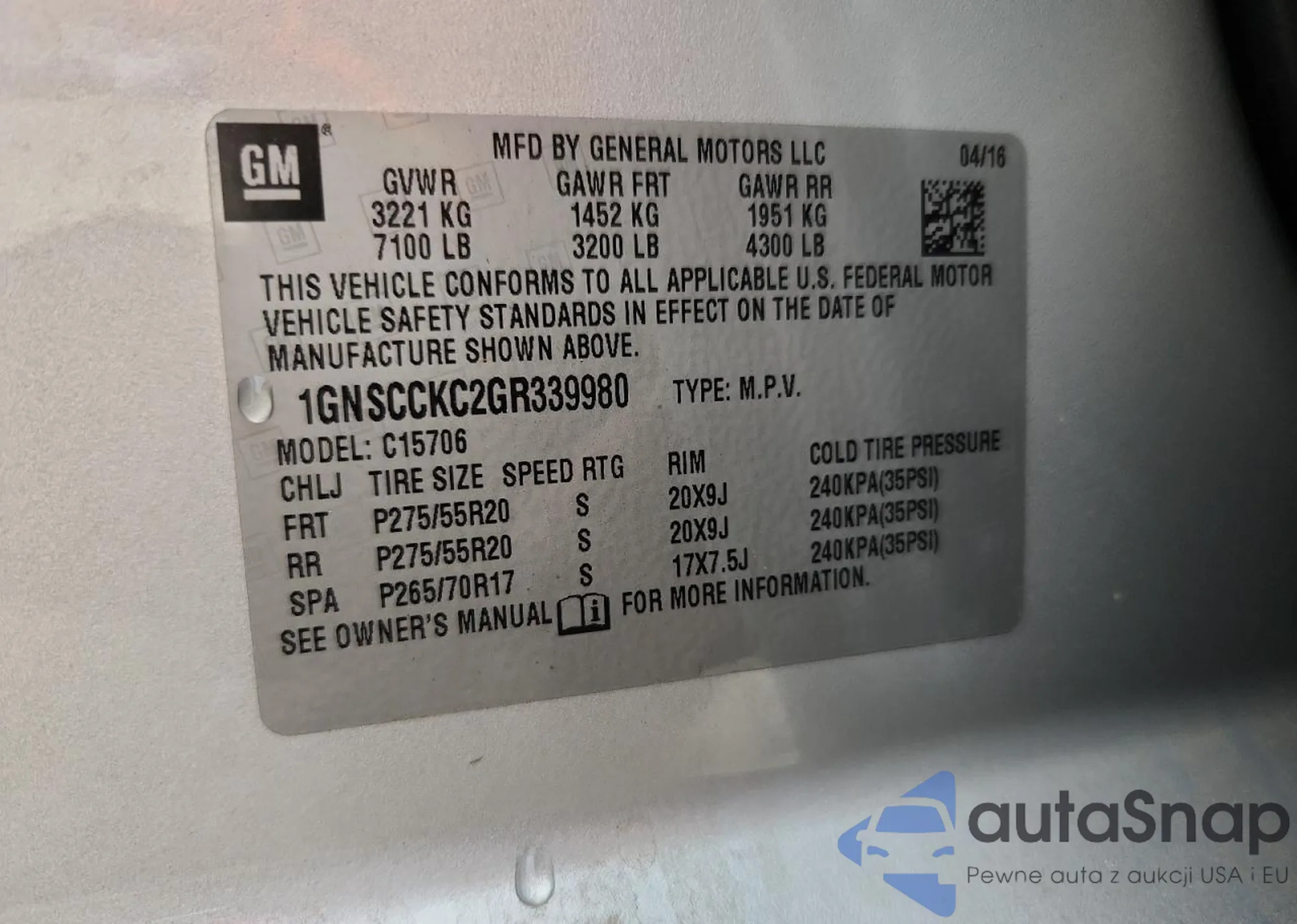 • VIN: 1GNSCCKC2GR339980