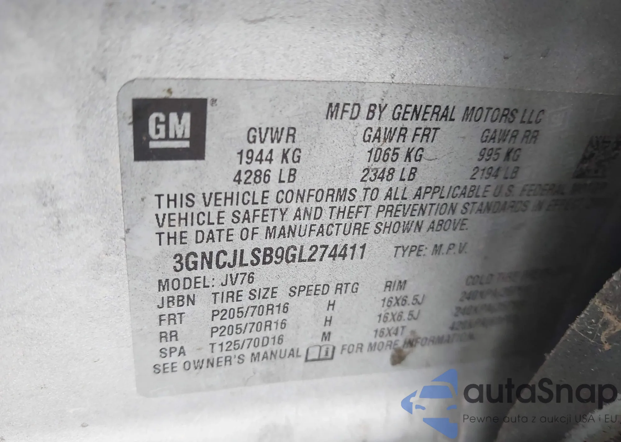 VIN: 3GNCJLSB9GL274411