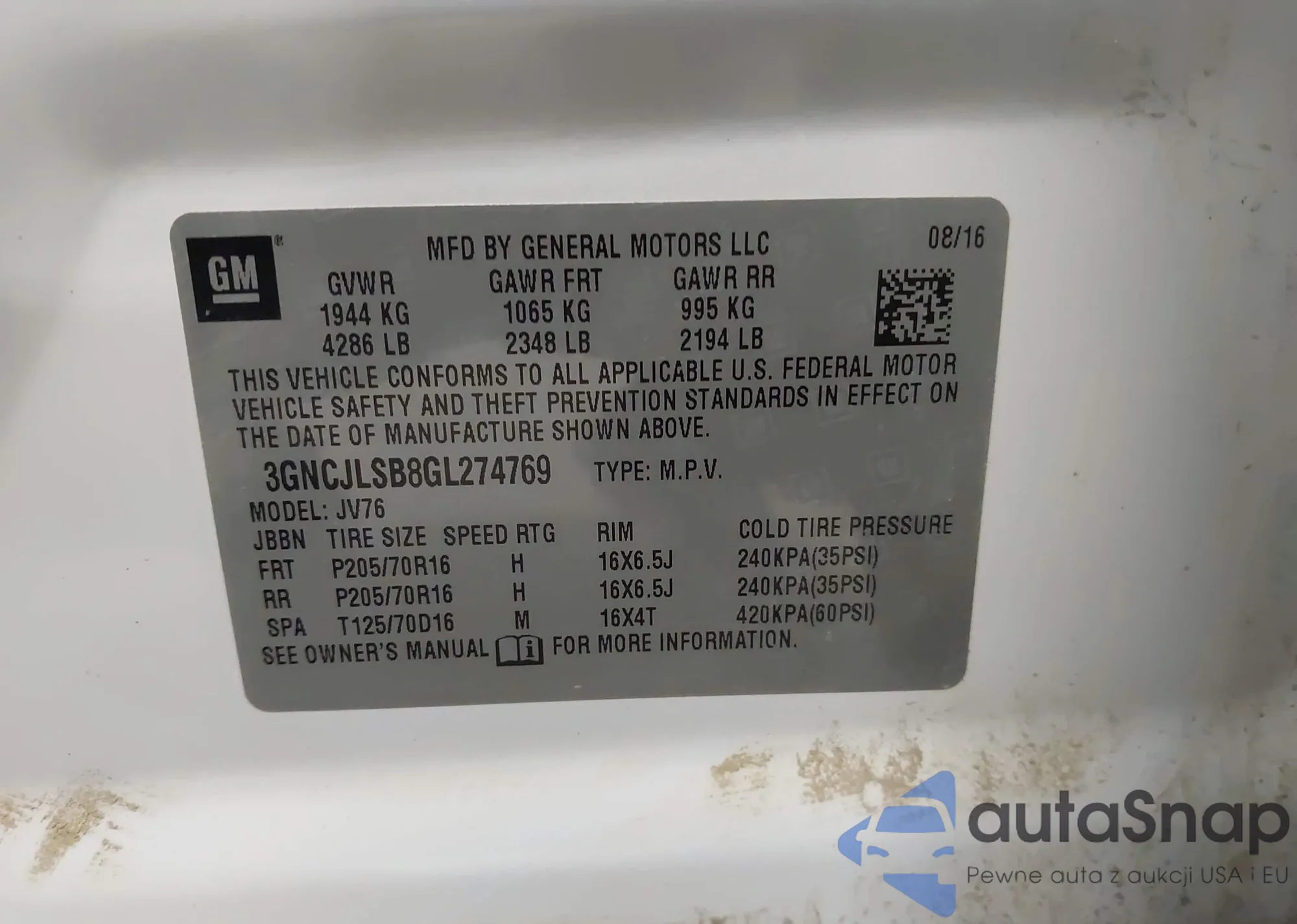 VIN: 3GNCJLSB8GL274769