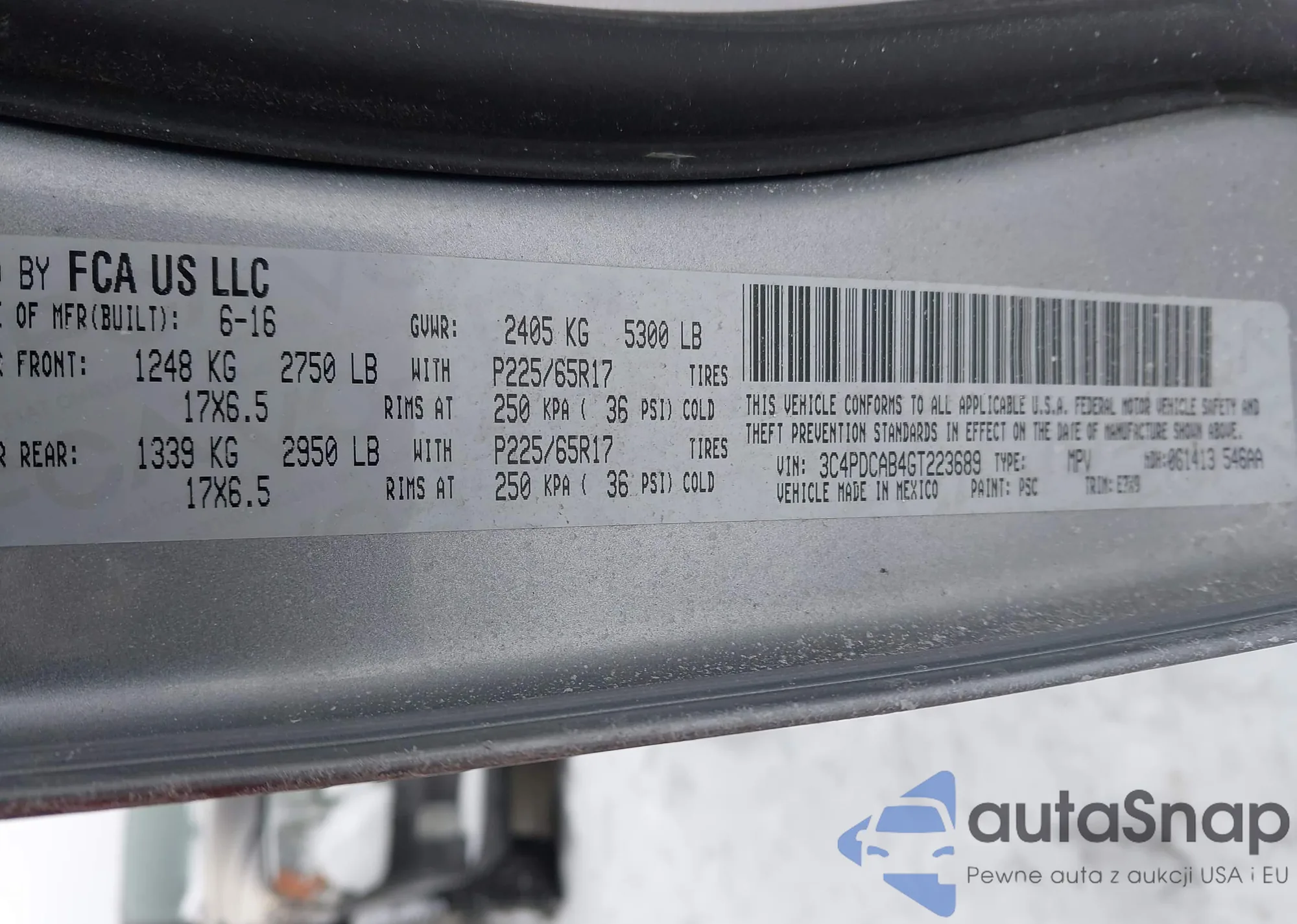 The car Dodge Journey 2016 (VIN 3C4PDCAB4GT223689) has not been auctioned before. The documents are clean, and the mileage matches or is below the market average. Sold by an insurance company – we recommend purchase. Delivery to the port will take approx. 6–8 weeks.