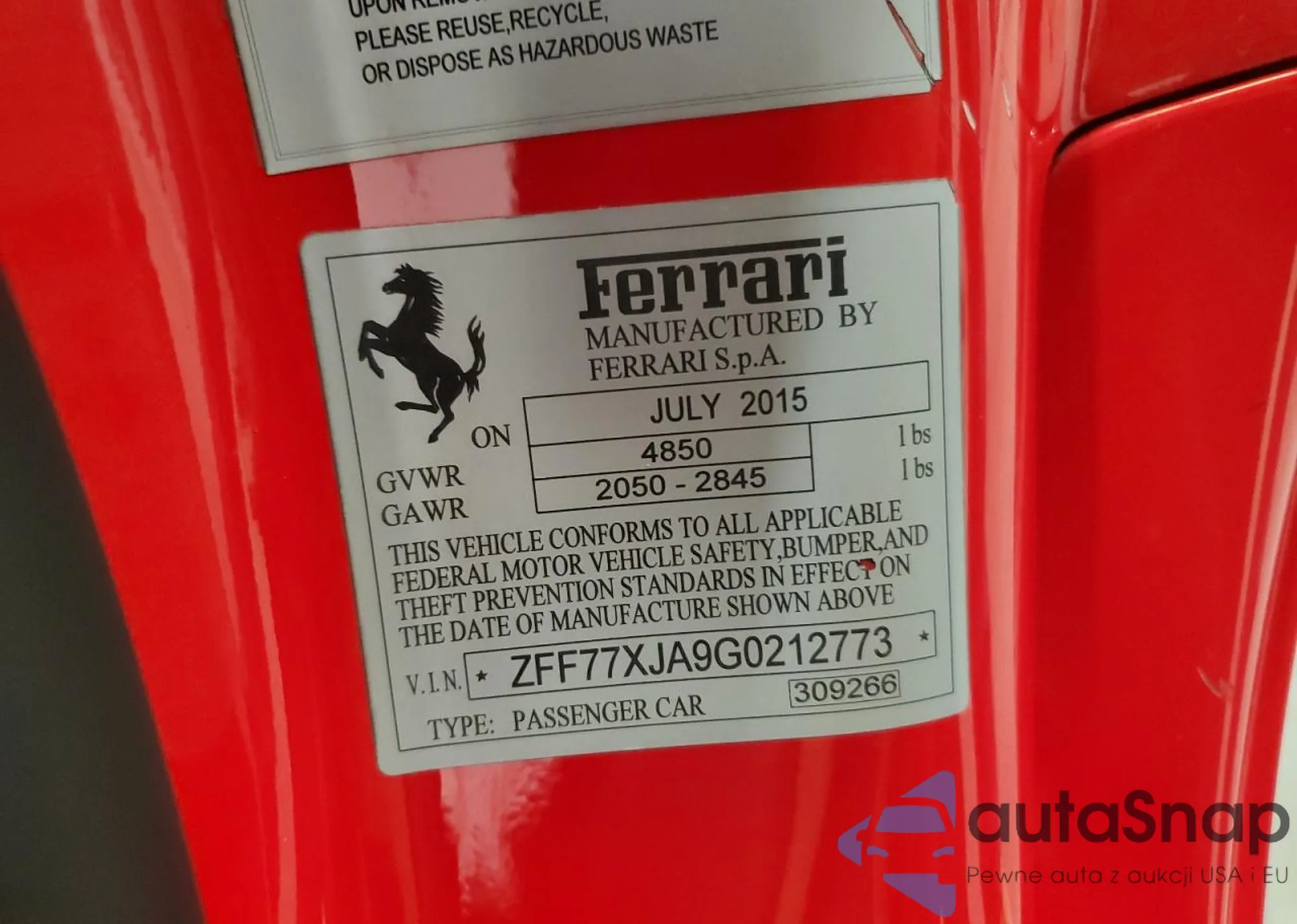 VIN: ZFF77XJA9G0212773