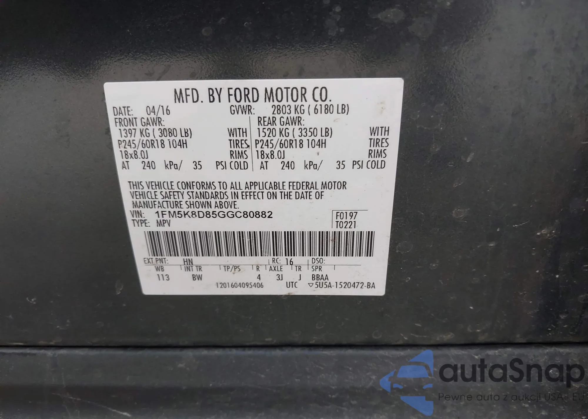 VIN: 1FM5K8D85GGC80882