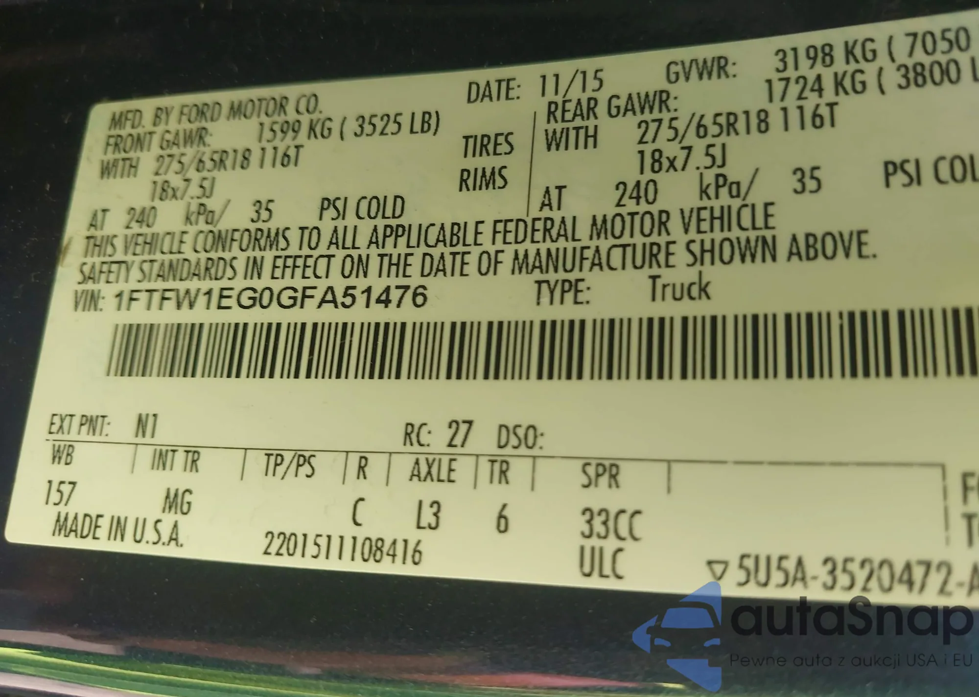 • VIN: 1FTFW1EG0GFA51476