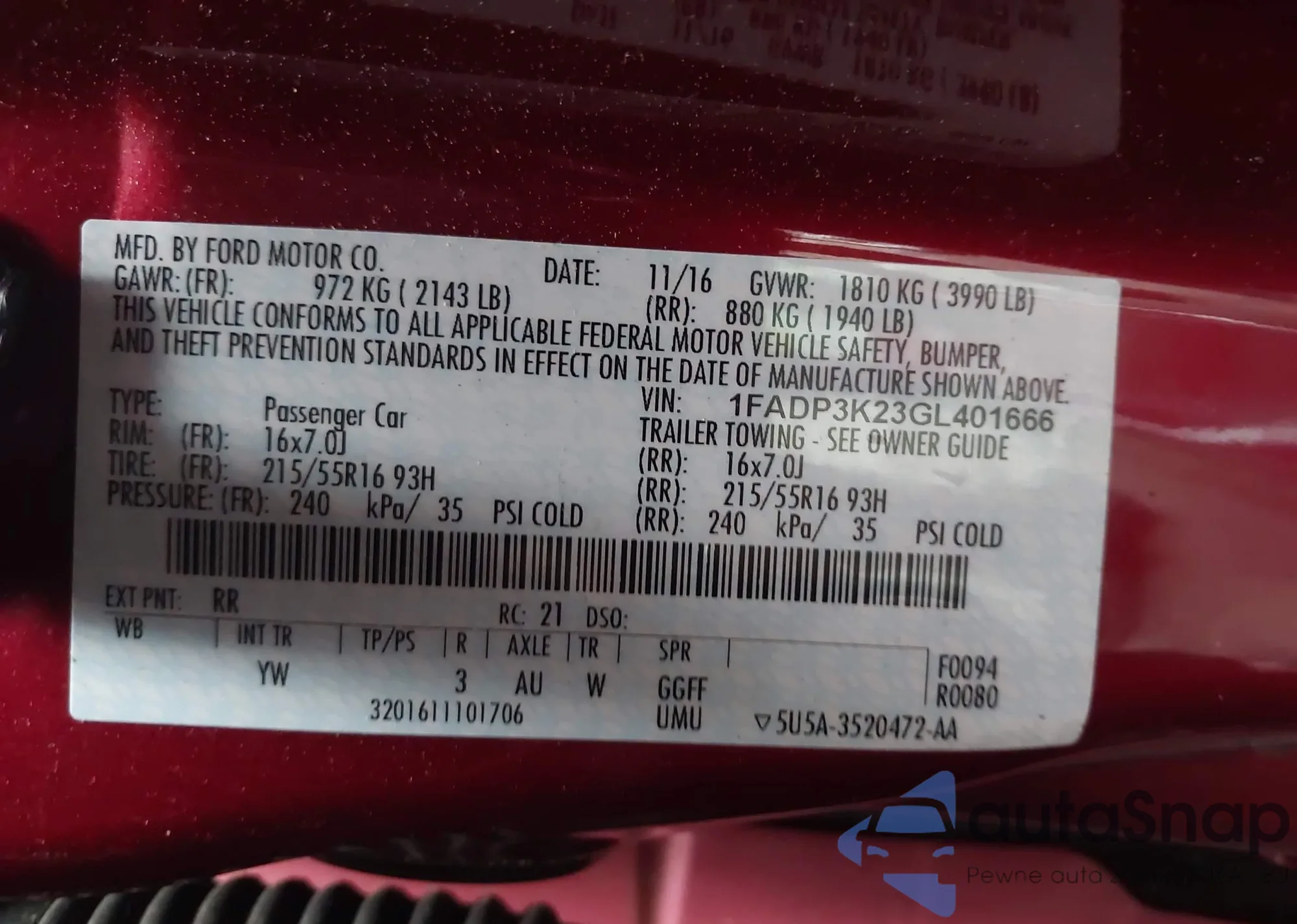 VIN: 1FADP3K23GL401666
