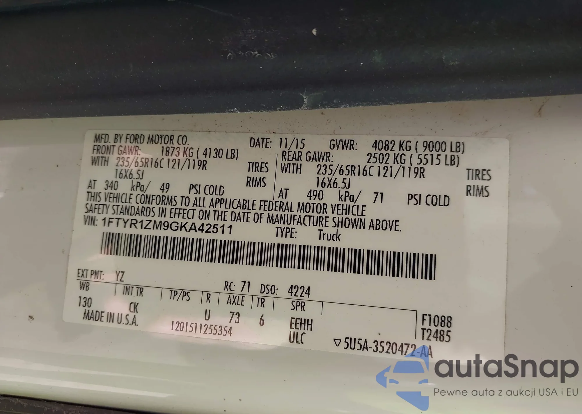 The car Ford Transit 2016 (VIN 1FTYR1ZM9GKA42511) has not been auctioned before. The documents are clean, and the mileage matches or is below the market average. Sold by an insurance company – we recommend purchase. Delivery to the port will take approx. 6–8 weeks.