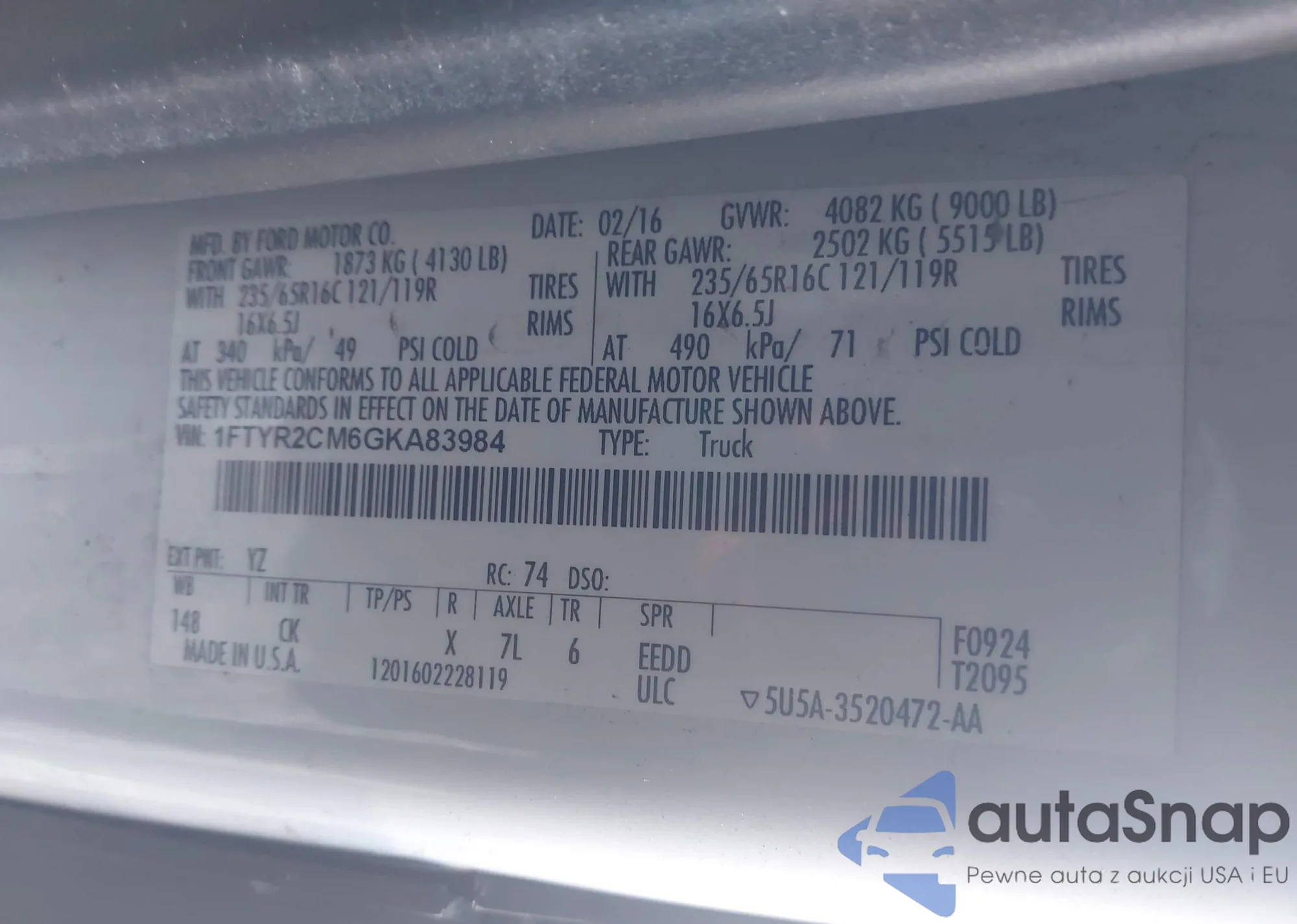The car Ford Transit 2016 (VIN 1FTYR2CM6GKA83984) has not been auctioned before. The documents are clean, and the mileage matches or is below the market average. Sold by an insurance company – we recommend purchase. Delivery to the port will take approx. 6–8 weeks.
