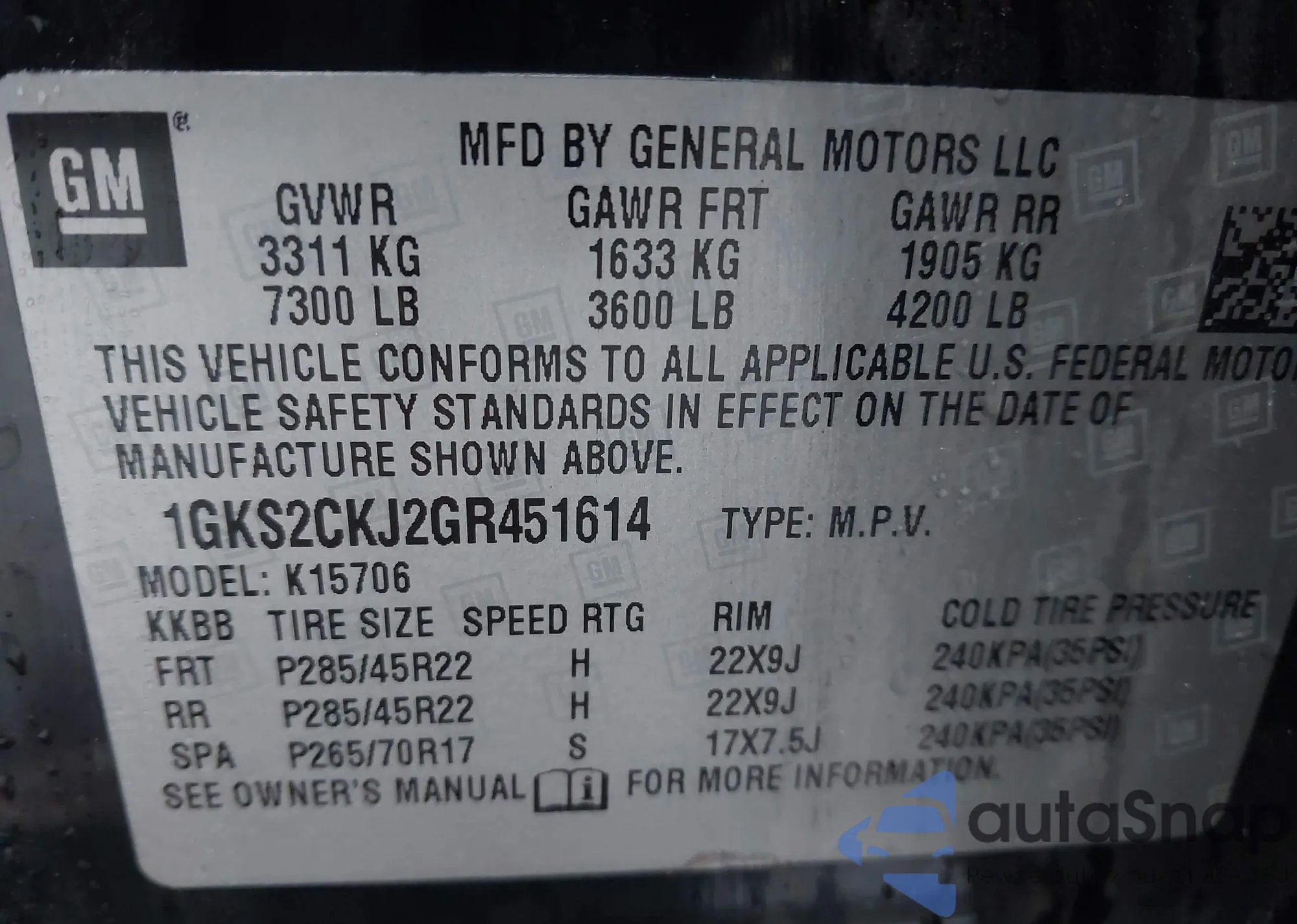 VIN: 1GKS2CKJ2GR451614