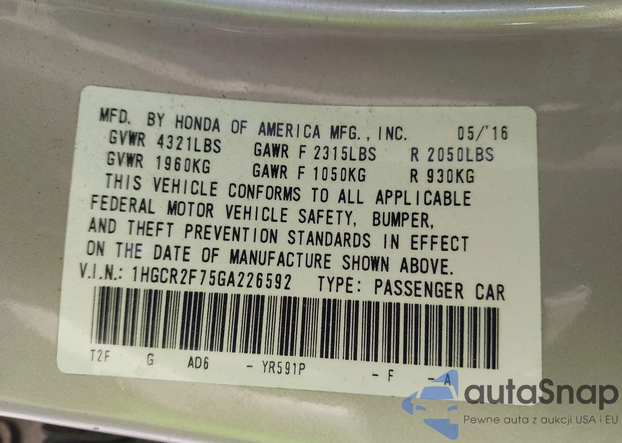 The car Honda Accord 2016 (VIN 1HGCR2F75GA226592) has not been auctioned before. The documents are clean, and the mileage matches or is below the market average. Sold by an insurance company – we recommend purchase. Delivery to the port will take approx. 6–8 weeks.