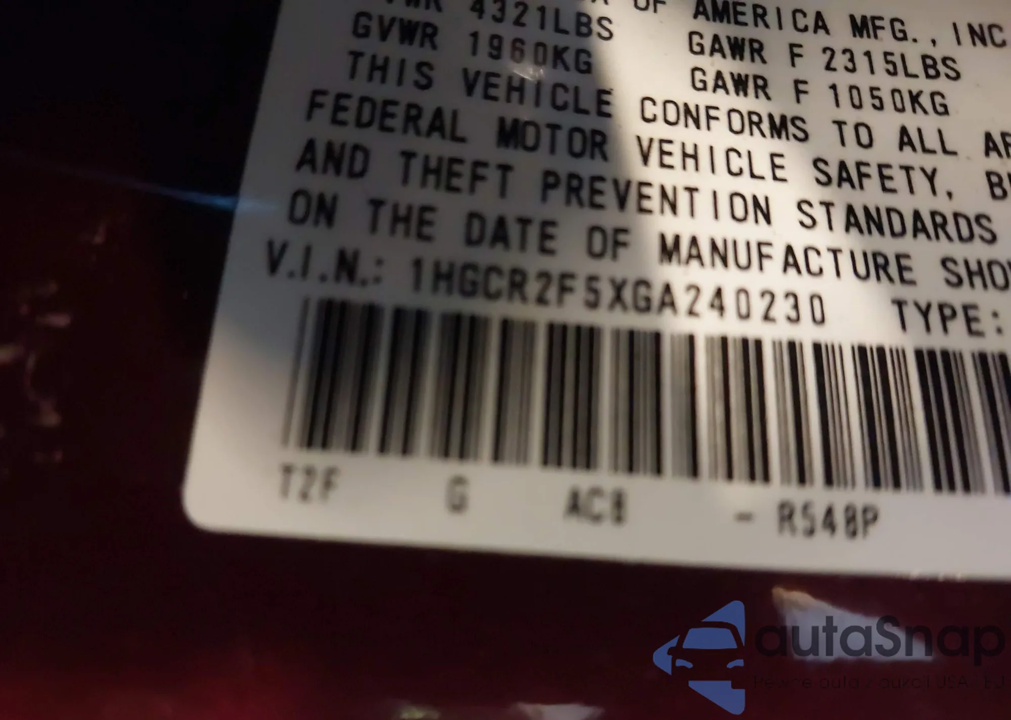 VIN: 1HGCR2F5XGA240230