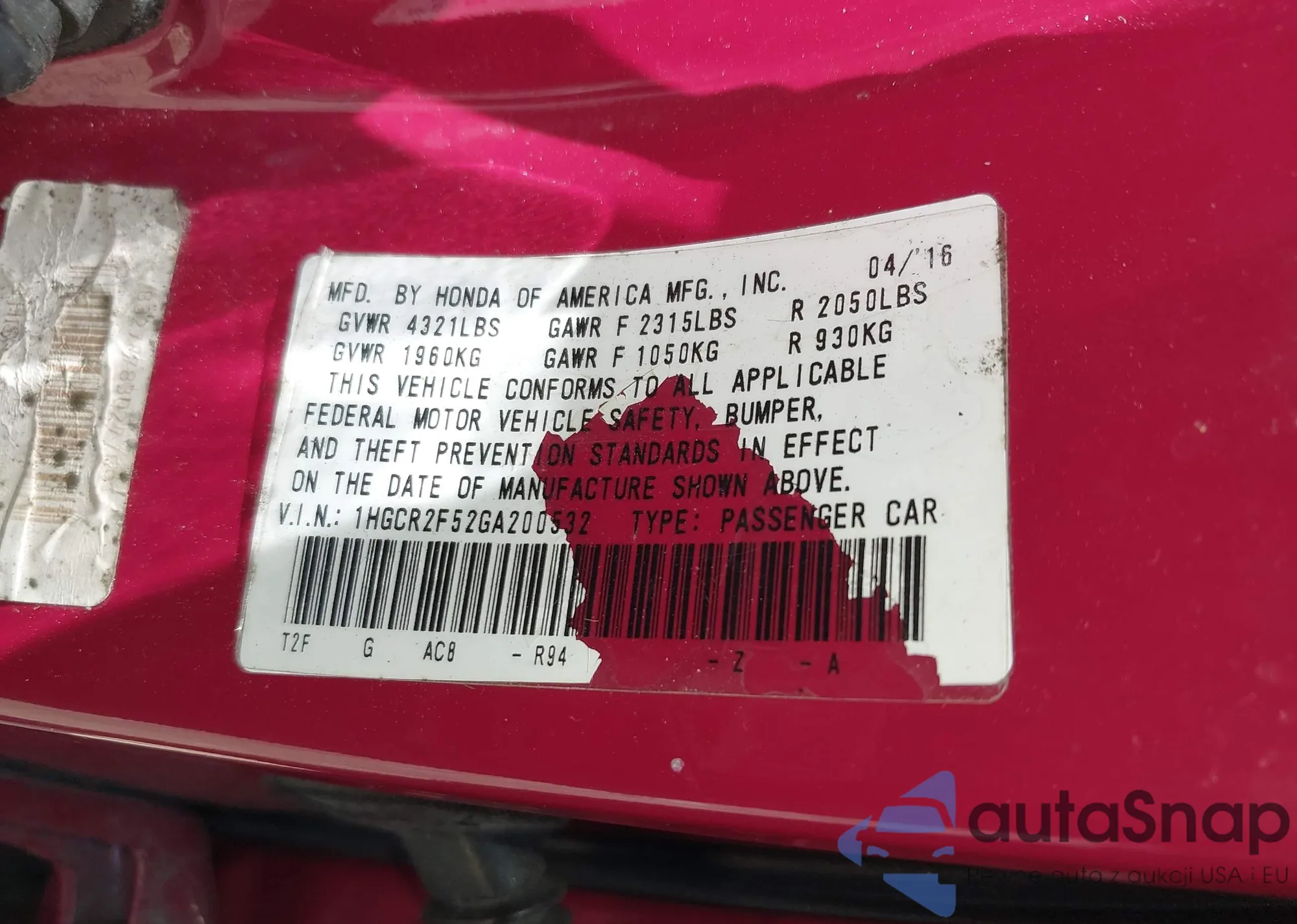 • VIN: 1HGCR2F52GA200532
