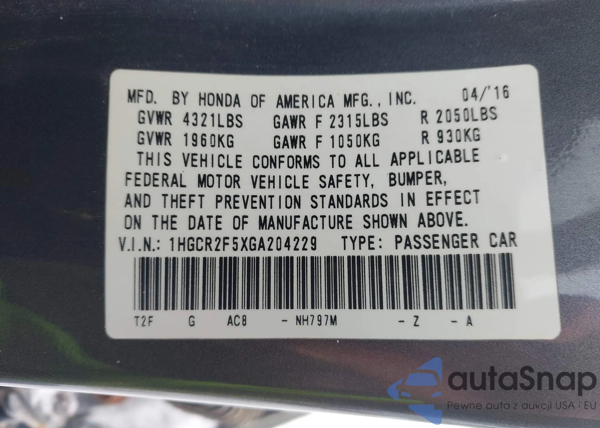 The car Honda Accord 2016 (VIN 1HGCR2F5XGA204229) has not been auctioned before. The documents are clean, and the mileage matches or is below the market average. Sold by an insurance company – we recommend purchase. Delivery to the port will take approx. 6–8 weeks.