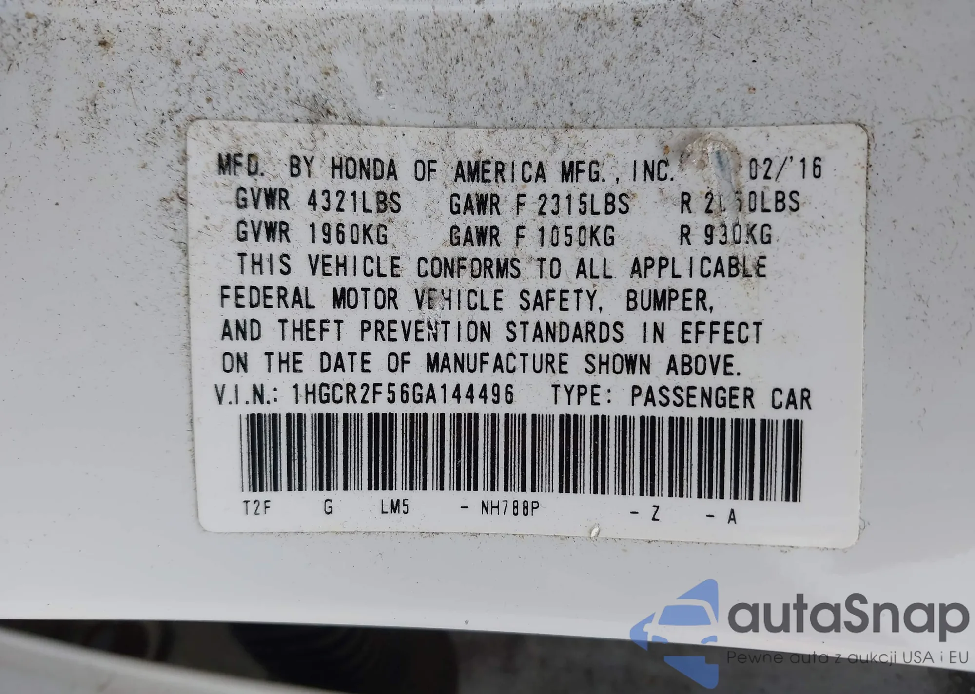 VIN: 1HGCR2F56GA144496