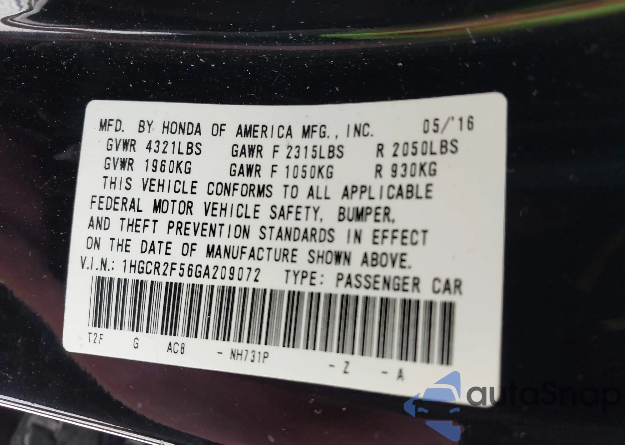 VIN: 1HGCR2F56GA209072