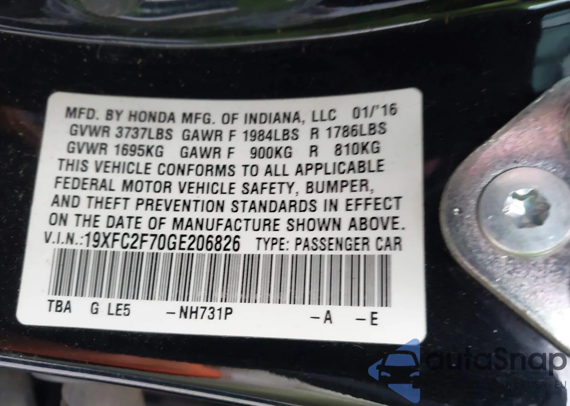 The car Honda Civic 2016 (VIN 19XFC2F70GE206826) has not been auctioned before. The documents are clean, and the mileage matches or is below the market average. Sold by an insurance company – we recommend purchase. Delivery to the port will take approx. 6–8 weeks.