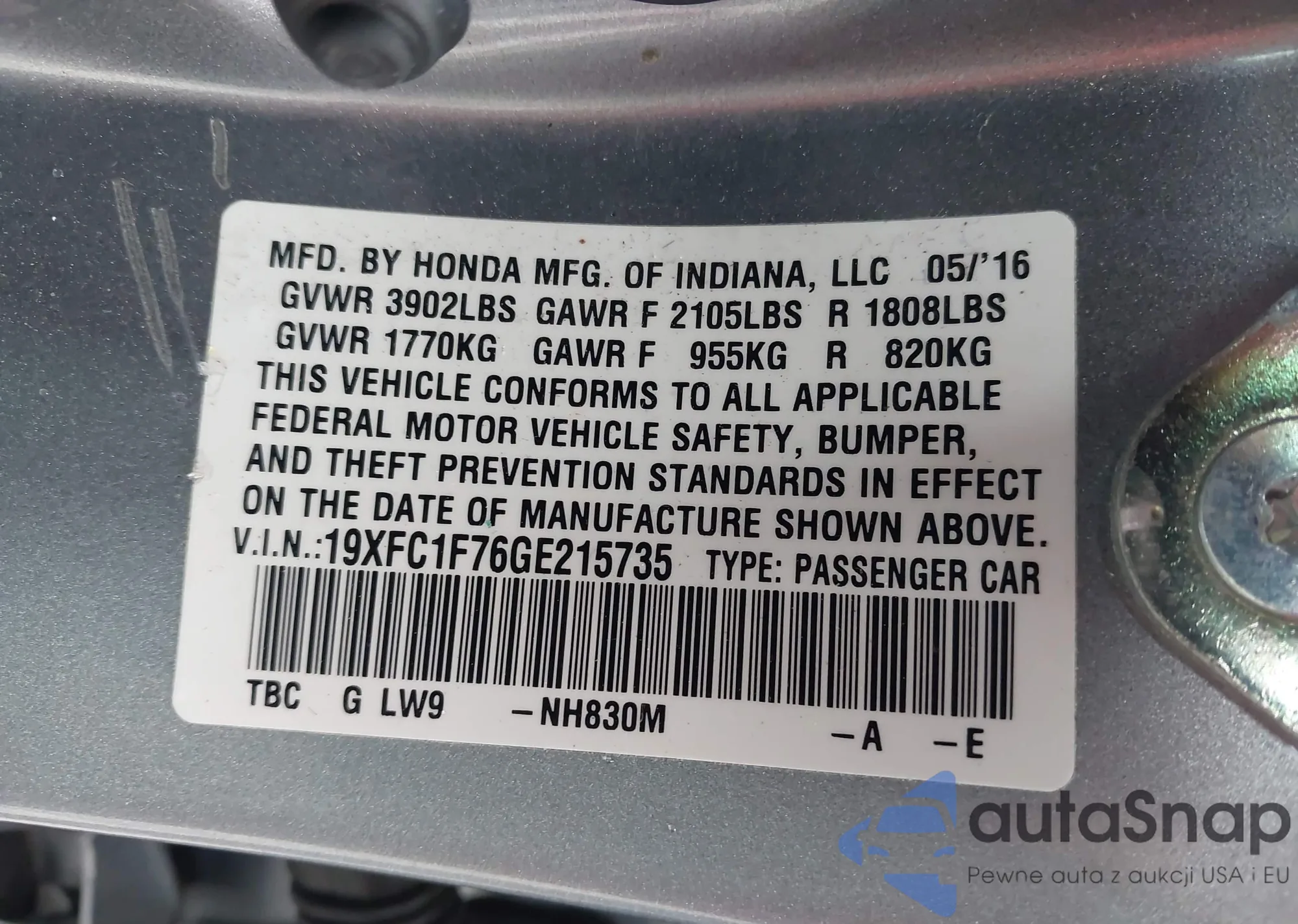 The car Honda Civic 2016 (VIN 19XFC1F76GE215735) has not been auctioned before. The documents are clean, and the mileage matches or is below the market average. Sold by an insurance company – we recommend purchase. Delivery to the port will take approx. 6–8 weeks.