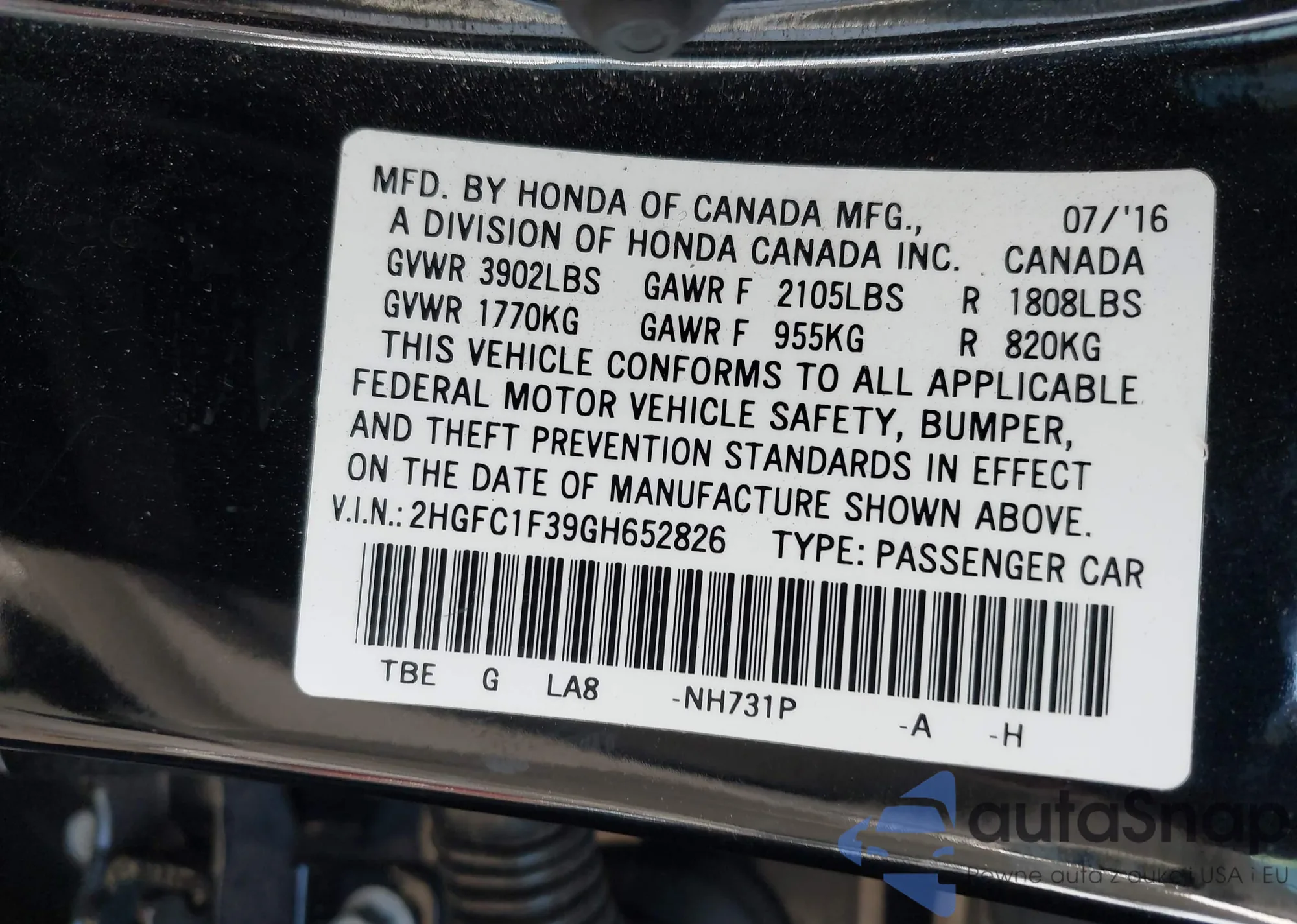 VIN: 2HGFC1F39GH652826